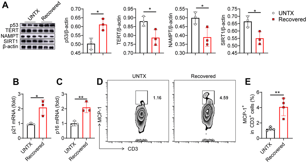 To further validate the immunosenescence of the lungs after severe pneumonia, we investigated several biologic hallmarks of aging in the lung tissue by various approaches. p53 activation can cause cell growth arrest or cell apoptosis and senescence, which is related to telomere dysfunction [23]. Telomerase reverse transcriptase (TERT) overexpression can stabilize telomeres and delay aging [24]. Niacinamide phosphoribosyl transferase (NAMPT) is mainly used to produce β-niacinamide mononucleotides in vivo, which are further converted to NAD+ [25]. SIRT1 protein levels decrease gradually with the aging process [26]. In our experiment, using western bolt assay, increased expression of p53 and decreased expression of TERT, NAMPT and SIRT1 were detected in the lung tissue of mice recovered from pneumonia, indicating that severe pneumonia accelerates lung aging (Figure 2A). We next detected the expression of mRNA p21 and p16 in the lung tissues by qPCR. They are both genes involved in the regulation of cell cycle, which have been linked to the aging process, with their expression increasing as cells age [27]. We found that both p21 and p16 mRNA expression were significantly increased in the lung tissues of recovered mice compared to that in untreated mice (Figure 2B, 2C). In addition, the level of monocyte chemoattractant protein-1 (MCP-1) increases with age, which is a hallmark of many age-related diseases [27]. Flow cytometry analysis of the expression of MCP-1 on CD3+ T cells showed that the T cells in lung tissue and peripheral blood also showed an aging pattern (Figure 2D, 2E and Supplementary Figures 2, 3). All these data indicated that pneumonia increased features of senescence in the lung, leading to a senescence-like phenotype of cellular senescence including T cells. Previous study showed that senescent cells appear in the lungs within hours following injury [28, 29]. Similarly, the rapid appearance of senescence markers was also reported in the liver in an acute injury model of hemorrhagic shock [28, 29], which was attributed to protection. Our result is consistent with recent reports, suggesting that senescence appearance following the injury may also contribute to the aging phenotype.