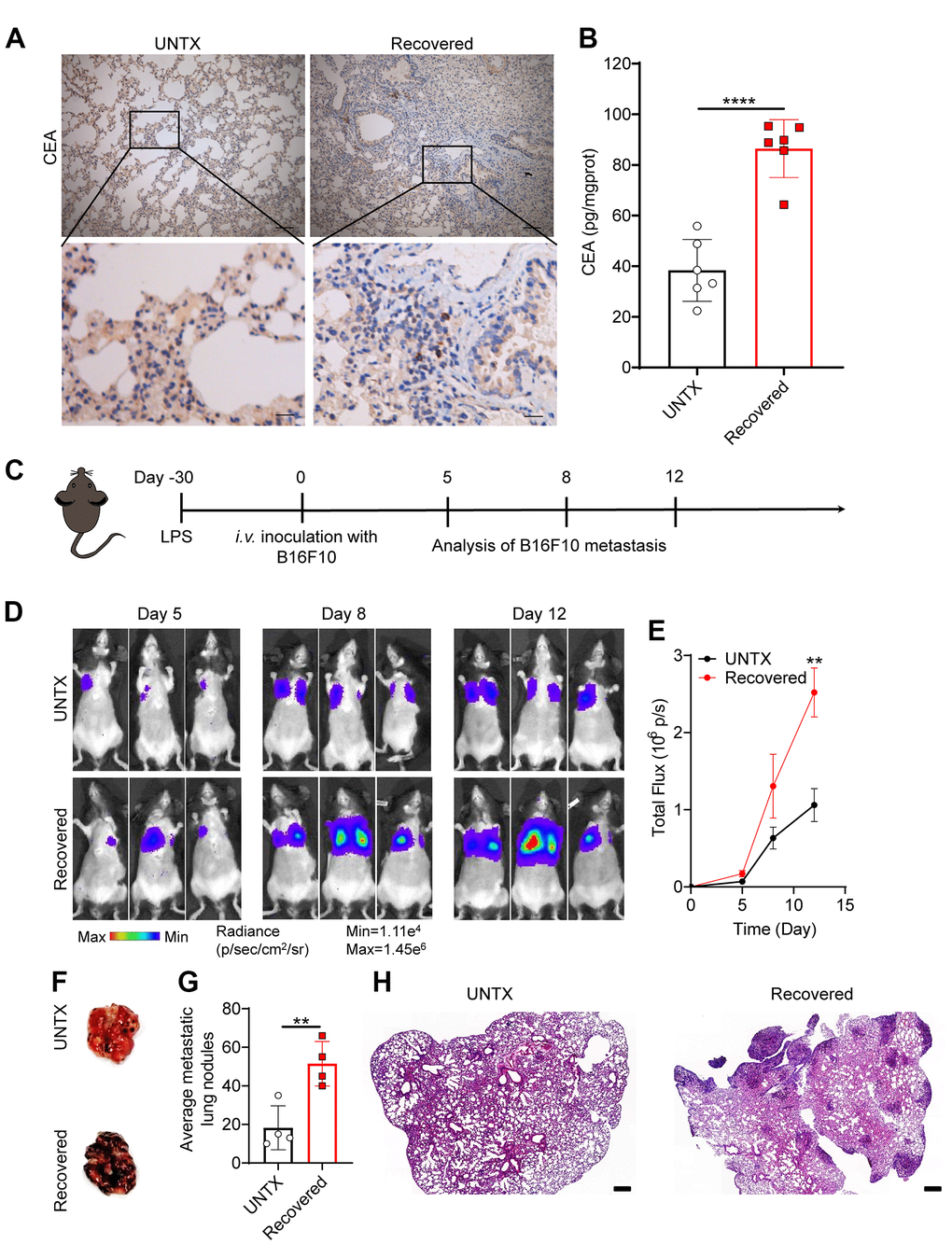 The C57BL/6 mice were divided into two groups, including the UNTX and 30D post-LPS groups. At 30 days after LPS attack, 2×105 B16F10-Luc cells were injected intravenously to construct a melanoma lung metastasis model. An in vivo fluorescence imaging system was used on days 5, 8 and 12 after tumor cell injection. The operation was set as 10 minutes after intraperitoneal injection of 10 μL/g d- luciferin potassium salt (15 mg/mL). Exposure time: 5 minutes.