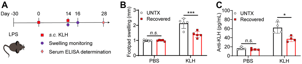 Elder people usually have a low vaccine response rate due to the decline of naive T cells [34]. In addition to the lung tissue, we next explore antigen response systemically in recovered mice. Delayed-type hypersensitivity (DTH) tests were performed to assess cell-mediated immunity in response to an antigen (Figure 4B). Keyhole limpet hemocyanin (KLH) is a xenogeneic protein antigen that can effectively trigger immune response in mice [35]. The recovered mice were immunized with KLH by footpad twice. The naïve mice were used as control. Similarly, diminished pad swelling and serum anti-KLH antibody levels were observed in mice recovered from pneumonia (Figure 4B, 4C). This result indicated the recovered mice had a low antigen response systemically.