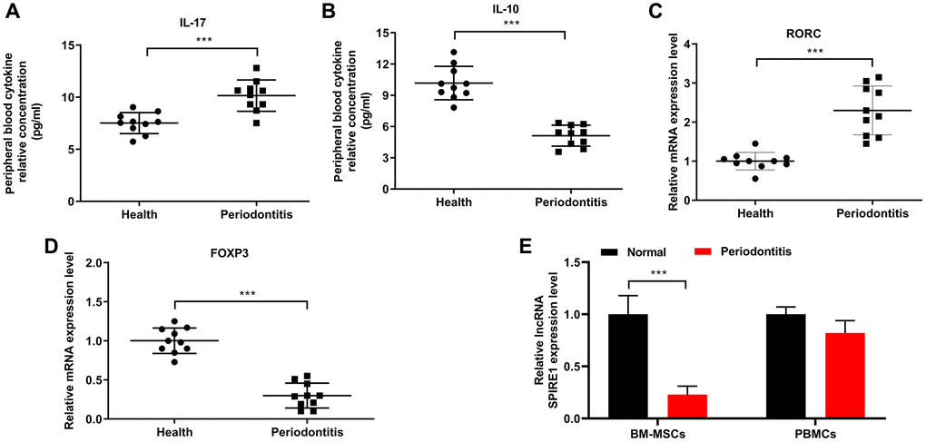 We first examined the immune status associated with periodontitis by comparing the levels of IL-17 and IL-10 from serum samples of healthy normal mice and periodontitis mice. As shown in Figure 1A and 1B, the serum level of IL-17 from the periodontitis group was significantly up-regulated, in comparison to the control healthy group; while that of IL-10 was considerably lower. Consistent with these observation on the imbalanced Th17/Treg immune status of whole body, the peripheral blood demonstrated a significantly more expression of RORC mRNA (Figure 1C) and markedly down-regulated expression of FoxP3 mRNA (Figure 1D) in periodontitis mice. To explore the potential roles of mesenchymal stem cells on the possible local Th17/Treg imbalance, we isolated mandibular BM-MSCs from these mice and confirmed their multi-potential differentiation capacities (Supplementary Figure 1). Notably, the mandibular BM-MSCs from the periodontitis group showed significantly reduced expression of LncRNA SPIRE1, compared with that from the healthy group; whereas peripheral blood samples had largely comparable levels of LncRNA SPIRE1 expression between two groups (Figure 1E), indicating that the local Th17/Treg imbalance might be more severe than that of the whole body.