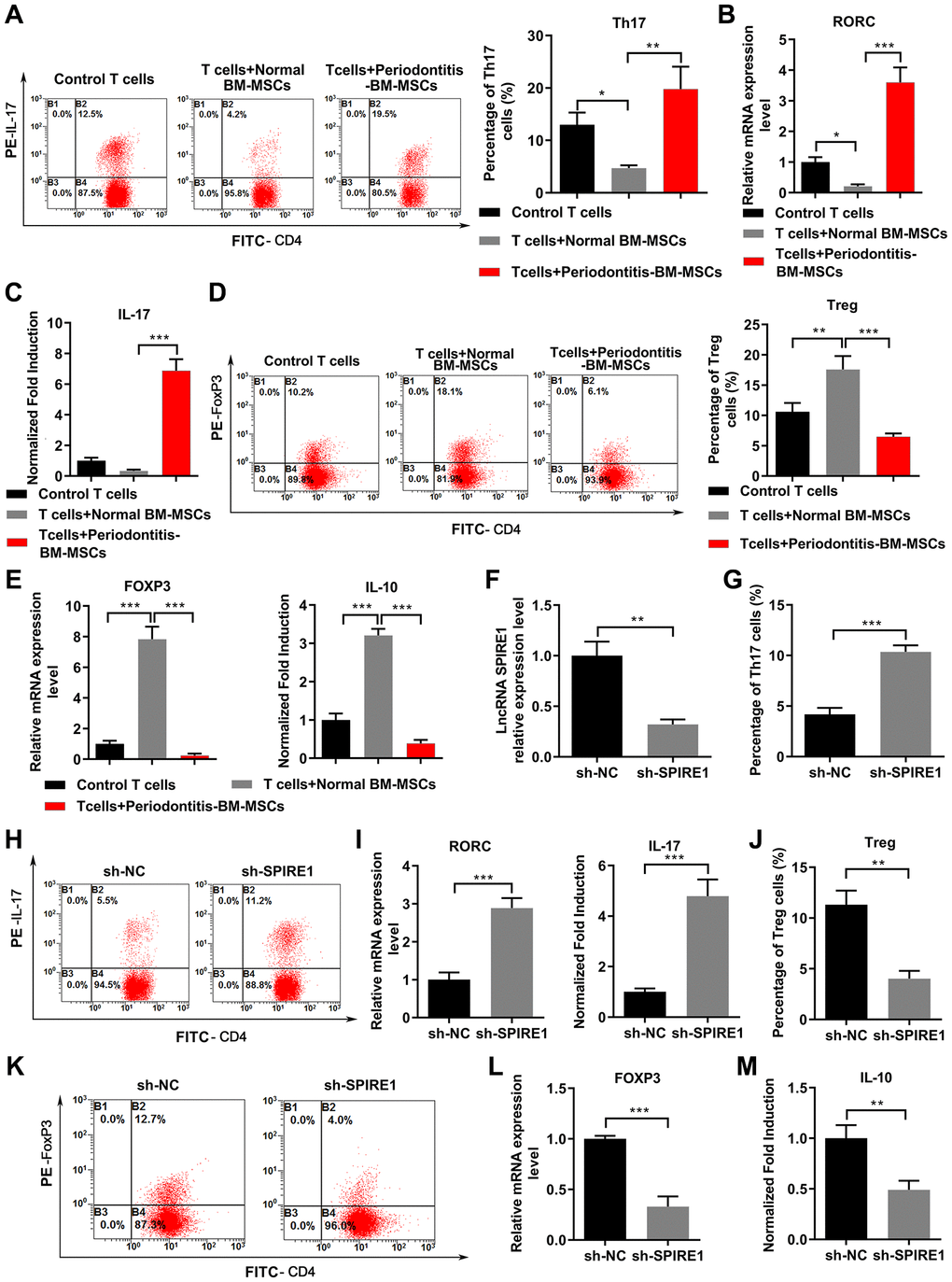 To further evaluate the contribution of LncRNA SPIRE1 knockdown on the immunomodulation ability of BM-MSCs, we tested the immunomodulation ability of normal mandibular BM-MSCs after shRNA-mediated LncRNA SPIRE1 knockdown (Figure 2F). As expected, silence of LncRNA SPIRE1 in BM-MSCs rendered a higher percentage of Th17 cells (Figure 2G and Figure 2H), a higher level of RORC mRNA, more production of IL-17 (Figure 2I) in CD4+ T cells under the Th17 polarization condition, and a lower percentage of Tregs (Figure 2J and Figure 2K), reduced expression of FoxP3 mRNA (Figure 2L) and secretion of IL-10 (Figure 2M) in CD4+ T cells under the Treg polarization condition. Taken together, these results suggested that LncRNA SPIRE1 knockdown in mandibular BM-MSCs from normal controls enhanced Th17 cell function and suppressed Treg cell function during MSCs-T cells coculturing.