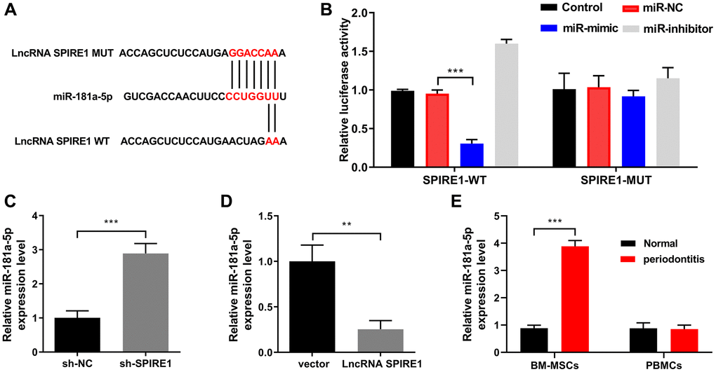 Our in silico analysis with the DIANA (http://diana.imis.athena-innovation.gr/DianaTools/index.php) and HMDD (http://www.cuilab.cn/hmdd) tools suggested that miR-181a-5p is a potential miRNA with multiple bases paired to LncRNA SPIRE1 (Figure 3A). To confirm the targeting relationship between these two molecules, we performed luciferase reporter assays in normal mandibular BM-MSCs after transfection of wild type or mutated LncRNA SPIRE1 together with miRNA mimics or inhibitors. As shown in Figure 3B, compared with the control cells with transfection of plasmids only, the cells transfected with wild type LncRNA SPIRE1 and miR-181a-5p mimics demonstrated significantly reduced luciferase activity, while the cells with simultaneous transfection of miR-181a-5p inhibitors had notable increase of luciferase activity. However, these phenomena were abolished in the cells with co-transfection of mutated LncRNA SPIRE1 (Figure 3B), which validated the specificity of sponging miR-181a-5p by LncRNA SPIRE1. Moreover, targeted knockdown (Figure 3C) or overexpression (Figure 3D) of LncRNA SPIRE1 resulted in significantly up-regulated or down-regulated miR-181a-5p expression in normal mandibular BM-MSCs, respectively. In addition, mandibular BM-MSCs from the periodontitis mice displayed obviously increased expression of miR-181a-5p than that from the normal mice (Figure 3E), further consolidating the targeting relationship between LncRNA SPIRE1 and miR-181a-5p.