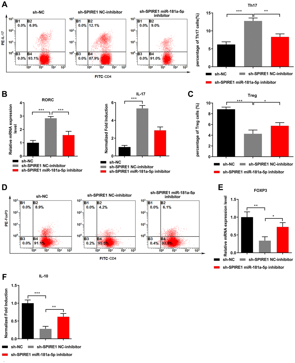 Functional assays in terms of the immune modulation ability of BM-MSCs were also conducted to validate the relationship between LncRNA SPIRE1 and miR-181a-5p. The LncRNA SPIRE1-silenced BM-MSCs were additionally transfected with NC-inhibitor or miR-181a-5p inhibitor, and co-cultured with activated CD4+ T cells to evaluate their immune suppressive functions. LncRNA SPIRE1 knockdown alone caused significantly increased percentage of Th17 cells (Figure 4A), upregulated expression of RORC mRNA and release of IL-17 (Figure 4B), while all these trends were greatly diminished upon additional miR-181a-5p inhibition. Similarly, the attenuated immunosuppression ability with a decreased frequency of Treg cells (Figure 4C and 4D), down-regulated FoxP3 expression (Figure 4E), and reduced production of IL-10 (Figure 4F) in BM-MSCs upon LncRNA SPIRE1 knockdown was evidently reversed after further miR-181a-5p inhibition. Therefore, these results together consolidated the notion that miR-181a-5p is a downstream molecule of LncRNA SPIRE1 in controlling the immunomodulation function of BM-MSCs.