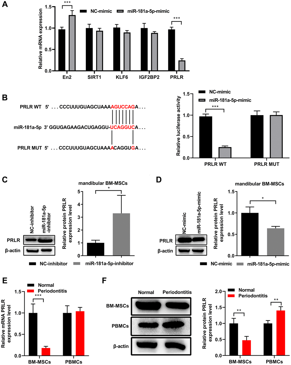 miR-181a-5p targeted PRLR in mandibular BM-MSCs, and PRLR showed down-regulated expression in mandibular BM-MSCs of mice with periodontitis