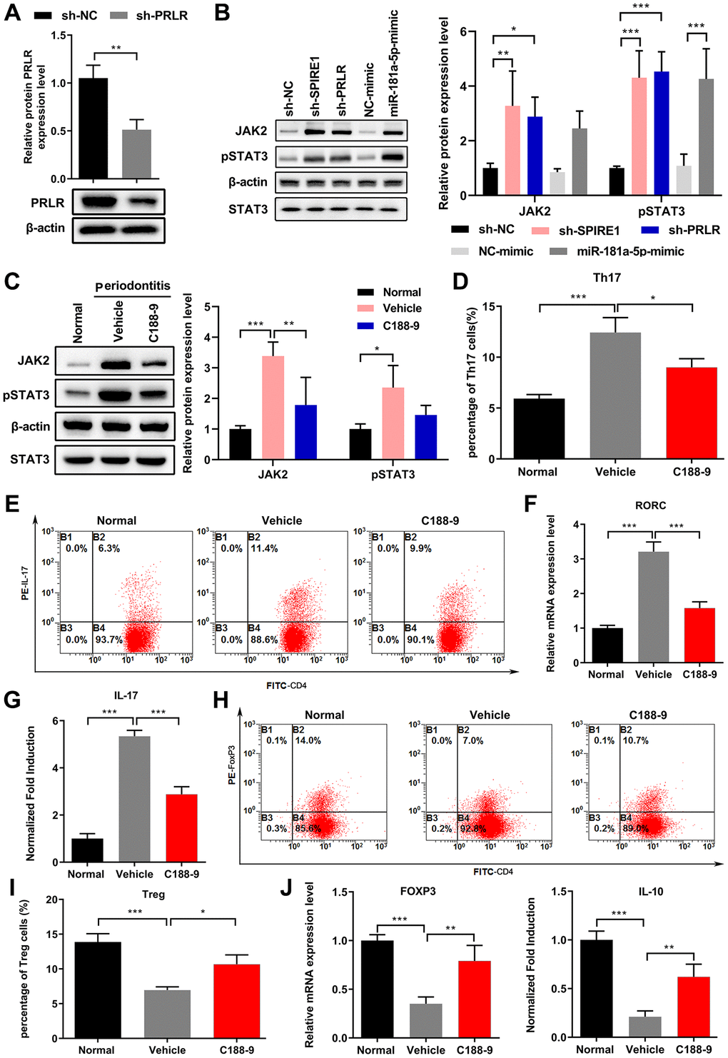 Since the JAK/STAT3 signaling was reported to regulate the inflammatory cascade and influence the adaptive immunity by modulating Th17/Treg cell differentiation [33], we investigated whether the LncRNA SPIRE1/miR-181a-5p/PRLR axis were associated with this signaling. First, we validated the efficacy of shRNA-mediated knockdown of PRLR in normal mandibular BM-MSCs (Figure 6A), and examined the impact of LncRNA SPIRE1 knockdown or PRLR knockdown, as well as the transient transfection of miR-181a-5p mimic, on regulation of the JAK/STAT3 signaling pathway. As shown in Figure 6B, periodontitis-associated changes in gene expressions, including downregulated expressions of LncRNA SPIRE1 or PRLR, and increased miR-181a-5p expression, resulted in significantly activated JAK/STAT3 signaling in normal BM-MSCs, in comparison to the transfected control cells. In addition, mandibular BM-MSCs from periodontitis mice also showed markedly more activated JAK/STAT3 signaling, as evidenced by higher levels of JAK2 and phosphorylated STAT3 proteins (Figure 6C). However, the treatment with C188-9, a synthetic small molecule that specifically inhibits the STAT3 pathway [35], showed obvious suppression of this pathway in BM-MSCs from periodontitis mice (Figure 6C). To validate the contribution of the activated JAK/STAT3 signaling on the impaired immune modulation ability of BM-MSCs from periodontitis mice, we additionally treated these BM-MSCs with C188-9 before and during their co-culturing with the CD4+ T cells. Inactivation of the STAT3 signaling remarkably restored the ability of periodontitis mandibular-derived BM-MSCs in immune suppression, as evidenced by significant reductions in the ratio of Th17 population (Figure 6D and 6E), decreased expression of RORC mRNA (Figure 6F), reduced production of IL-17 (Figure 6G), as well as increased ratio of Treg cells (Figure 6H and Figure 6I), increased FoxP3 mRNA expression and increase secretion of IL-10 (Figure 6J), when compared to the group with vehicle treatment.