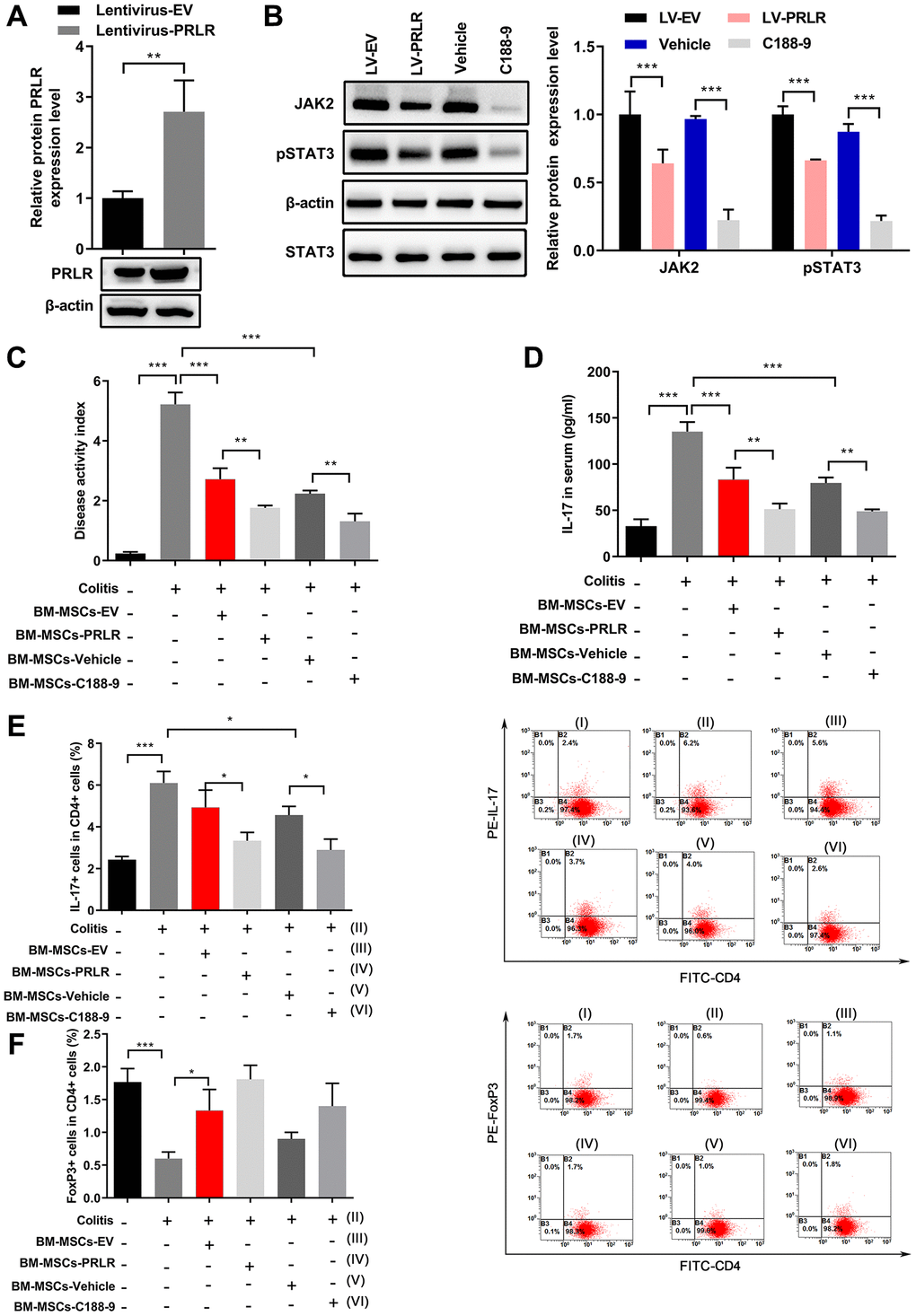 In addition, PRLR was also overexpressed to further confirm its role in the periodontitis development (Figure 7A). PRLR overexpression significantly decreased the JAK/STAT3 signaling, while C188-9 treatment obviously enhanced these changes (Figure 7B). Overexpression of PRLR significantly decreased the inflammatory injury and serum IL-17 levels after BM-MSCs infusion under inflammatory environment in an acute colitis mouse model, and C188-9 treatment of BM-MSCs also resulted in similar changes (Figure 7C and 7D). Further analyses presented that PRLR overexpression in BM-MSCs markedly decreased the percentages of IL-17+ cells but decreased the percentages of FoxP3+ cells among mouse blood CD4+ cells, while C188-9 treatment of BM-MSCs led to similar changes, in comparison to the respective control treatment (Figure 7E and 7F). Therefore, the LncRNA SPIRE1/miR-181a-5p/PRLR axis regulated the JAK/STAT3 signaling in mandibular BM-MSCs to modulate the Th17/Treg balance.