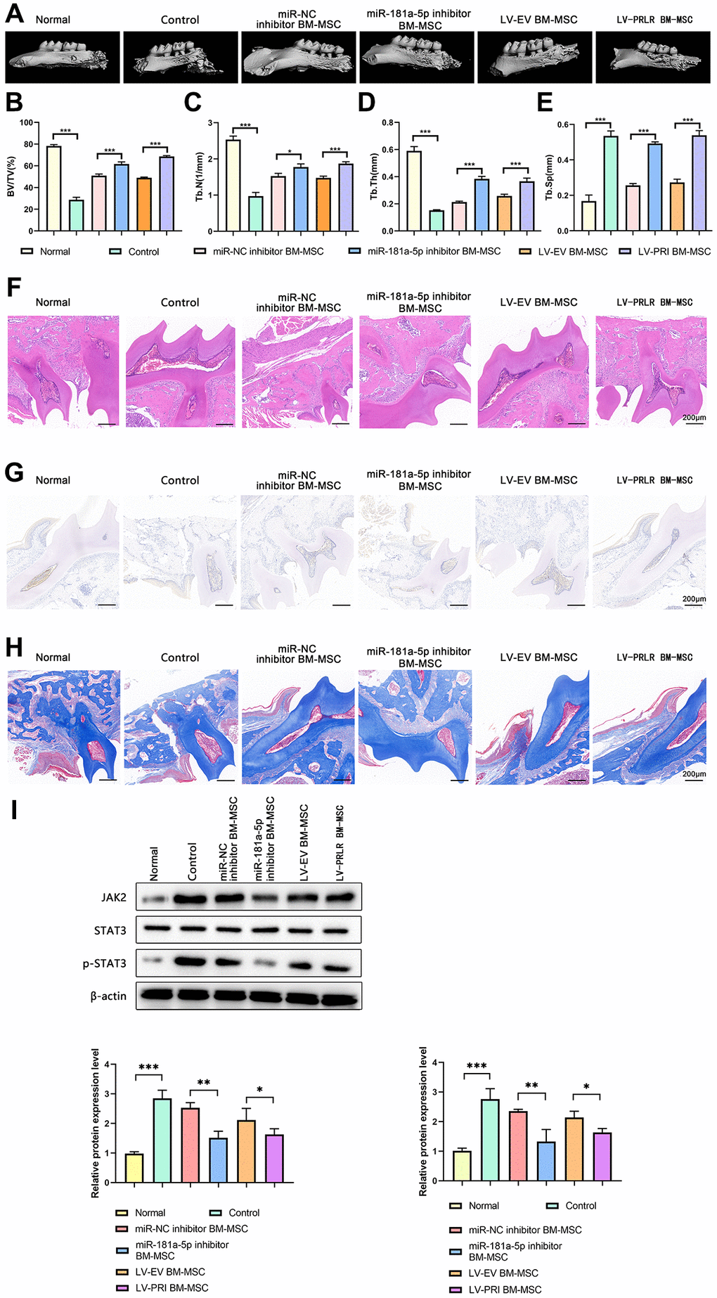 Further histological examination by H&E staining (Figure 8F) and TRAP staining (Figure 8G) showed that the un-treated group displayed severe colonic transmural inflammation with increased wall thickness, infiltration of inflammatory cells, degeneration of crypt architecture, and loss of osteoblast cells. Notably, the treated groups with BM-MSCs infusion had significantly reduced number of osteoclasts than the un-treated group, while the group with infusion of the miR-181a-5p or PRLR expression-altered BM-MSCs showed the lowest number of osteoclasts in mouse periodontal tissues. Consistently, periodontal regeneration observed by Masson’s trichrome staining also showed that these groups had the best osteogenic differentiation of bone progenitor cells (Figure 8H). Moreover, the protein quantitation by western blot analysis showed that the periodontal tissues from the mice infused with the miR-181a-5p or PRLR expression-altered BM-MSCs demonstrated significantly reduced activity of JAK/STAT3 signaling (Figure 8I), strengthening the notion that inhibition of the JAK/STAT3 signaling pathway in BM-MSCs enhanced their immunomodulation ability.