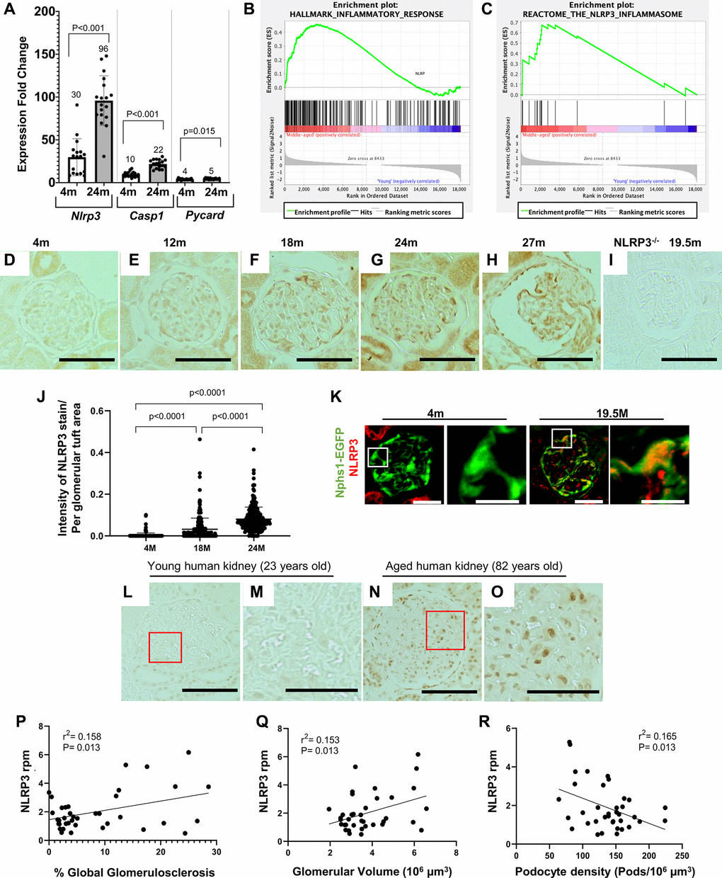 Next, to address the translational potential, we examined NLRP3 immunostaining in podocytes of aged human kidneys. NLRP3 was not detected in glomeruli from young (23 years old) healthy human kidneys (Figure 1L, 1M). In contrast, NLRP3 staining was increased in glomeruli of aged (82 years old) human kidneys (Figure 1N, 1O). Higher transcript expression levels for NLRP3 in micro-dissected human glomeruli were associated with increased percent of globally sclerosed glomeruli (Figure 1P), higher glomerular volume (Figure 1Q) and reduced podocyte density (Figure 1R), assessed as previously described [19, 38].