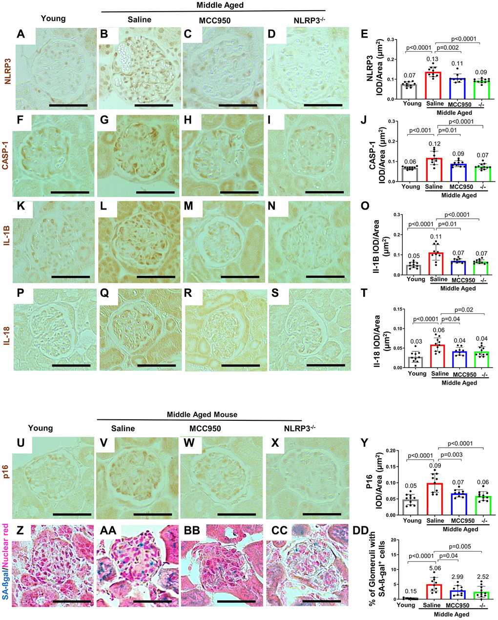 Finally, we examined key NLRP3 pathway mediators. In line with the mRNA-seq and the qRT-PCR analyses (Figure 1A–1C), immunostaining for NLRP3 (Figure 2A, 2B, 2E), Caspase-1 (Figure 2F, 2G, 2J), IL-1β (Figure 2K, 2L, 2O) and IL-18 (Figure 2P, 2Q, 2T) were higher in glomeruli of middle-aged mice compared to young mice, predominantly in a podocyte distribution. Similarly, Caspase-1 staining was barely detected in young healthy human kidneys but increased in podocytes with age (Supplementary Figure 2A–2D).