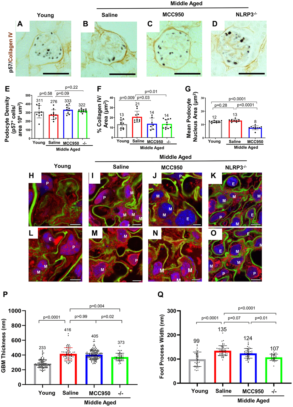 Finally, we assessed glomerular ultrastructure by FLARE and expansion microscopy (Figure 3H–3O). Quantification of these images demonstrated that the glomerular basement membrane (GBM) thickness increased (283 nm vs. 416 nm, P < 0.0001, Figure 3P) and foot process width increased (107 nm vs. 134.7 nm, P < 0.0001, Figure 3Q) in middle-aged saline-treated control mice compared to young mice. While GBM thickness did not change during the 6-week-long MCC950 treatment (405 nm vs. 416 nm, P = 0.37), it was reduced in the middle-aged NLRP3 null mice (373 nm vs. 416 nm, P = 0.002, Figure 3P). This is in line with the idea that GBM remodeling is not instantaneous [47–49] and likely takes longer than the 6 weeks of MCC950 treatment. However, foot process width was reduced in both MCC950-treated mice (123.6 nm vs. 134.7 nm, P = 0.012) and in NLRP3 null mice (107.1 nm vs. 134.7 nm, P < 0.001, Figure 3Q). In summary, the data demonstrate that decreasing or deleting NLRP3 improved podocyte lifespan in glomeruli of middle-aged mice.