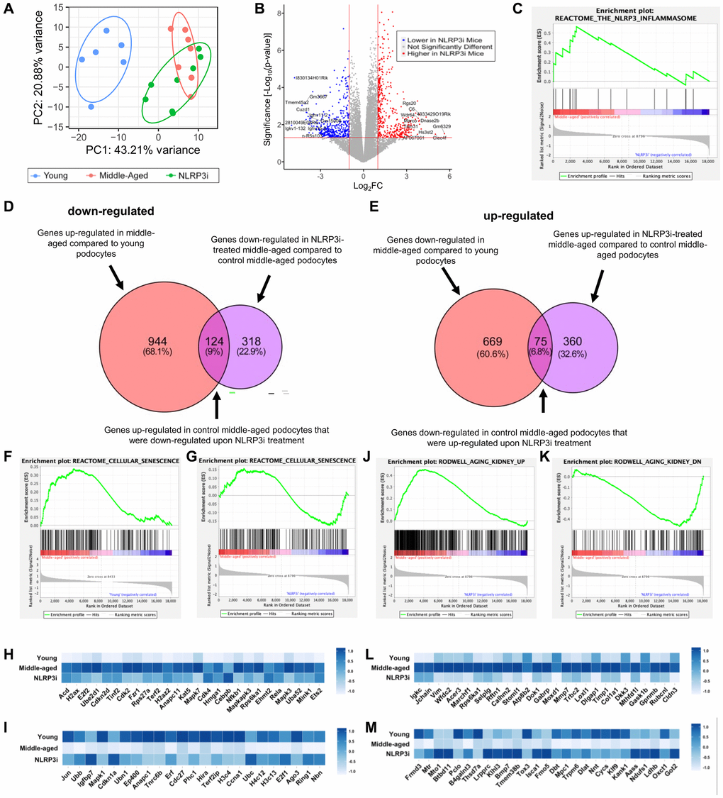 To obtain a better understanding of potential mechanisms responsible for the slowing of glomerular aging upon inhibition of NLRP3, we isolated podocytes from individual mice from each group (young, middle-aged/vehicle-treated and middle-aged/MCC950-treated) and performed transcriptome analyses. Principal component analysis showed excellent clustering of the individual groups (Figure 5A) with many differentially expressed transcripts between middle-aged/MCC950-treated vs. middle-aged/vehicle-treated podocytes (Figure 5B). As expected, GSEA analysis demonstrated that podocytes from mice treated with MCC-950 exhibited inhibition of the NLRP3 signaling pathway (Figure 5C). We next analyzed the significantly altered transcripts for their contribution to the aging process. Using a threshold of 2-fold and a P-value of 0.05 a total of 442 genes were down-regulated and 435 genes were up-regulated in middle-aged/MCC950-treated podocytes compared to middle-aged/vehicle-treated podocytes (Figure 5D, 5E). Of the down-regulated transcripts, 124 genes (9%) were also up-regulated in aged vs. young podocytes. Similarly, of the up-regulated transcripts, 75 genes (7%) were down-regulated in aged vs. young podocytes. GSEA analysis (Supplementary Figure 1B) confirmed the data shown in Figure 2 at the global level where both up- and down-regulated genes in response to senescence were restored by NLRP3i treatment (Figure 5F–5I). These findings were extended by examining a gene set specifically generated to assess kidney aging [51] which showed an even more pronounced impact (Figure 5J–5M). In summary, these data suggest activation of NLRP3 signaling is part of the natural podocyte aging process.