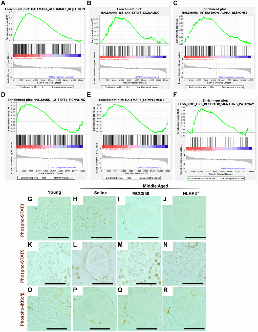 Interestingly, GSEA showed that inhibition of NLRP3 signaling was consistent with the reversal of the inflammatory phenotype in podocytes (Supplementary Figure 1C). In addition to the NLRP3 inflammasome, several additional inflammatory pathways that were increased in middle-aged podocytes compared to young were at least partially lowered in mice treated with MCC950. This included allograft rejection (Figure 6A), IL6 signaling (Figure 6B), Interferon alpha (Figure 6C), IL2/Stat5 signaling (Figure 6D), complement (Figure 6E) and NOD-like receptor signaling (Figure 6F). This effect was confirmed by immunostaining for phospho-STAT3, a marker of active interferon and IL6 pathways (Figure 6G–6J). Phospho-STAT3 immunostaining was not detected in podocytes of young mice, was increased in middle-aged saline-treated mice, but was reduced by MCC-950 treatment and was barely detected in the podocytes of NLRP3 null mice. A similar trend was observed for phospho-STAT5, a marker for active IL2 signaling (Figure 6K–6N) Importantly, not all inflammatory pathways were increased in middle-aged saline-treated mice nor reduced following NLRP3 inhibition. For example, immunostaining for phospho-IKKa/β, a marker of active TNF signaling, did not increase in middle-aged glomeruli (Figure 6O–6R).