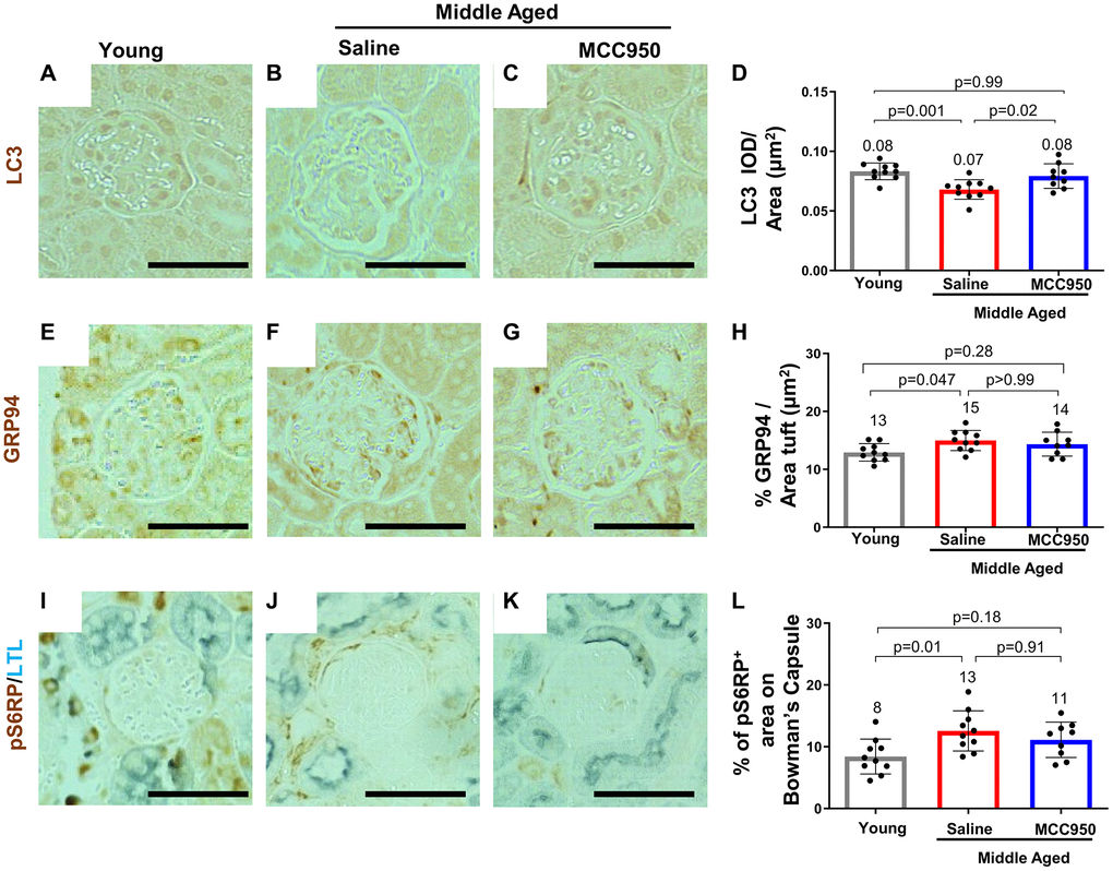 A reduction in canonical gene/protein expression in aged podocytes is normally accompanied by cell death, detachment and an inability of podocytes to self-renew to replace the lost cells [52]. Interestingly, besides the KRAS hallmark pathway, which has been shown to be functionally connected to NLRP3 signaling, [53, 54] none of those pathways were identified by the GSEA (Supplementary Figure 1B). To further substantiate this observation, we performed immunofluorescence studies comparing glomeruli of young, saline- and MCC950-treated middle-aged mice. Indeed, apoptosis as a contributor to podocyte death seems unlikely, as we were unable to detect increased glomerular Caspase-3 staining in control middle-aged mice (not shown). Other pathways shown to lead to podocyte loss [52] such as the endoplasmic reticulum stress (ERS) [55, 56] and autophagy stress pathways were also only slightly or not at all impacted by NLRP3i treatment. Immunostaining for the autophagy marker LC3 was barely detected (Figure 7A–7D). Conversely, the ERS associated proteins GRP94/Hsp90b1 were up-regulated in the middle-aged mice, but not significantly restored by MCC950 treatment (Figure 7E–7H). Finally, the active mTOR marker pS6 ribosomal protein (pS6RP) was higher in saline treated middle-aged mice but was unaffected by MCC950 treatment (Figure 7I–7L). Together, these data suggest that the pro-podocyte effect of NLRP3 inhibition at middle-age was primarily caused by inhibition of pyroptosis and only to a small extent by reduced ER stress and augmented autophagy.