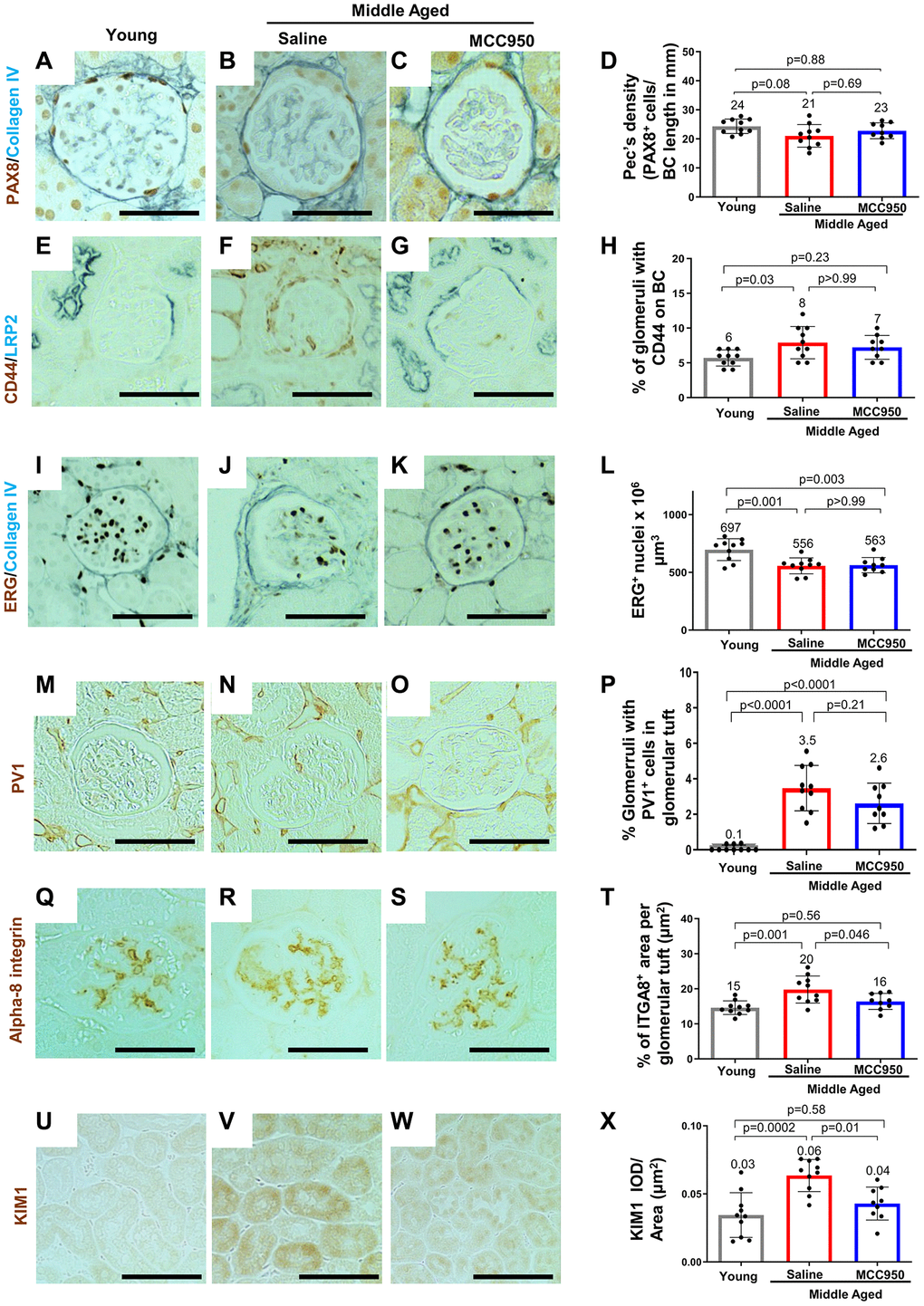 Compared to young mice, middle-aged/vehicle-treated mice had a decrease in the density of parietal epithelial cells (PAX8 staining) (Figure 8A–8D) accompanied by an increase in their activation (CD44 staining) (Figure 8E–8H). Glomerular endothelial cell density (ETS-related gene, ERG [57] staining) was also decreased in middle-aged/vehicle-treated mice (Figure 8I–8L), accompanied by an increase in the glomerular endothelial injury marker plasmalemmal vesicle associated protein-1 (PV1) [58] (Figure 8M–8P). The mesangial marker alpha 8 integrin was higher in middle-aged/vehicle-treated mice compared to young mice (Figure 8Q–8T). However, in contrast to the data shown earlier on middle-aged podocytes, none of the changes in non-podocyte glomerular cells were impacted by inhibiting NLRP3 with MCC950 (Figure 8). In contrast, the increase in the tubular epithelial cell injury marker KIM1 was reduced in middle-aged/MCC950-treated mice (Figure 8U–8X).