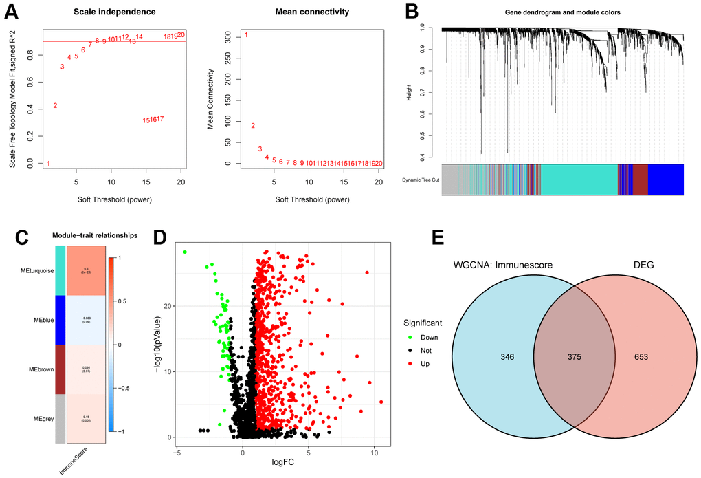 WGCNA is a powerful bioinformatics algorithm that can efficiently integrate highly correlated genes into the same module and perform correlation analysis between modules and phenotypes [13]. First, based on the mRNA expression profile of the TCGA-HCC cohort, we obtained Immunescore using the ESTIMATE algorithm and set a soft threshold with reference to a previous study [14]. Then, WGCNA analysis was performed to screen out the module genes significantly correlated with the Immunescore, and the module with the largest correlation coefficient was selected for further analysis according to the Pearson correlation coefficient.