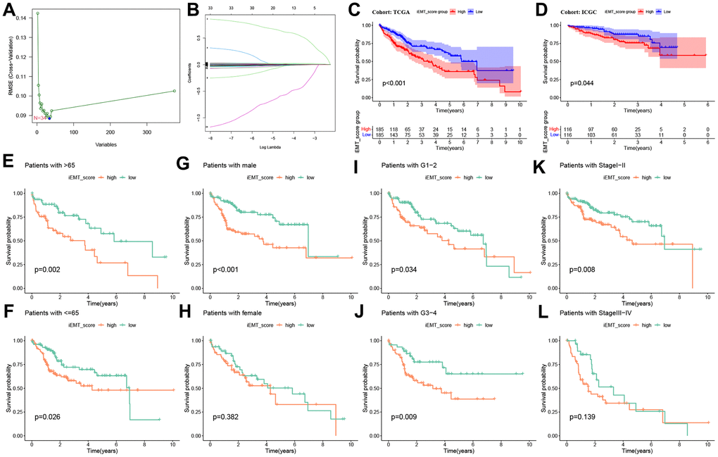 First, to identify the most important genes in iEMT, we used SVM-REF for further screening. The results showed that the optimal feature subset contains 34 iEMTs (Figure 2A). Then, we included OS data, identified three central genes (ARMC9, ADAM15, STC2, Figure 2B) using Lasso regression analysis, and constructed iEMT_score based on this. We then divided TCGA-HCC patients into high iEMT_score group and low iEMT_score group based on median iEMT_score. The Kaplan-Meier curve shows that patients in the higher iEMT_score group had worse OS than those in the low iEMT_score group (Figure 2C). Interestingly, this result was replicated in the validation cohort ICGC-HCC, where patients with low iEMT_score had better OS than those with high IEMT_score (Figure 2D). In addition, we further determined the prognostic value of iEMT_score in HCC patients with different pathological features. The results showed that iEMT_score could not effectively predict the prognosis of HCC patients in women and patients with tumor stages I-II, but showed excellent prognostic ability in the rest of the groups. Collectively, these results suggest that our iEMT_score can effectively predict the prognosis of HCC patients (Figure 2E–2L).