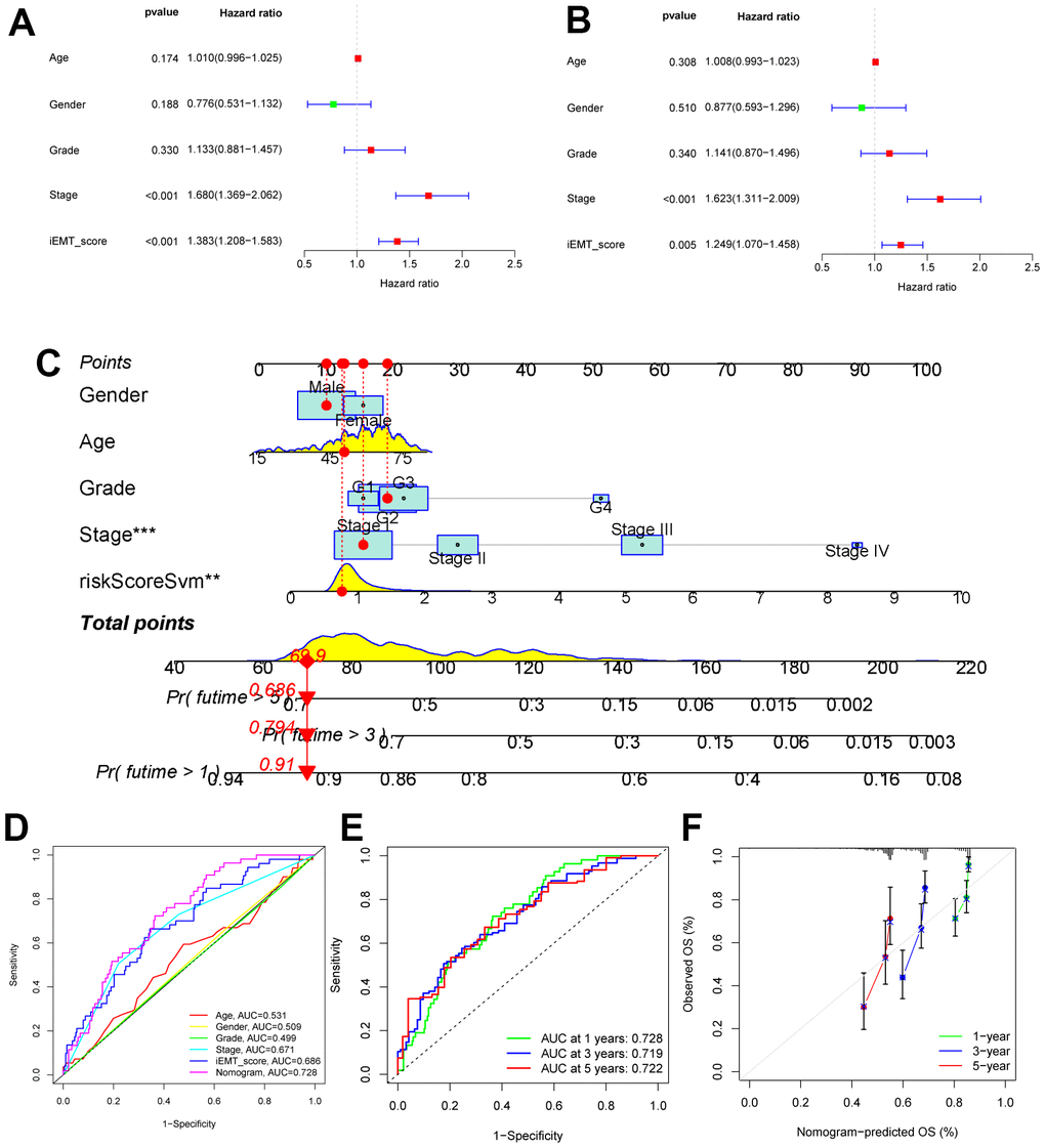 First, we included clinical data from patients (age, sex, tumor grade, and stage) and used both univariate and multivariate Cox to explore whether iEMT_score is an independent factor influencing OS in HCC patients. Based on this, we combined iEMT_score and clinical data to construct a nomogram that is easy for clinicians to use, and evaluated the accuracy and stability of the nomogram using ROC curves and calibration curves.