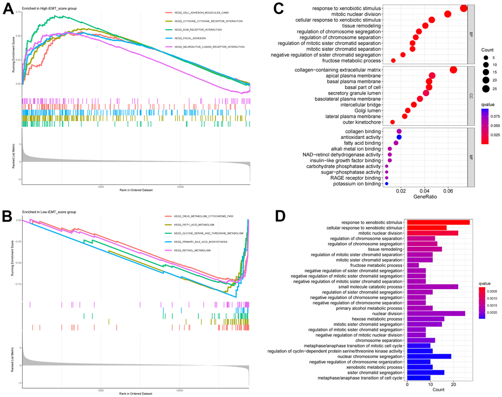 To further explore the mechanism of action that iEMT_score influences HCC, we divided patients into high iEMT_score group and low iEMT_score group by iEMT_score median and further performed GSEA. The results showed that the signaling pathways affected by the high iEMT_score group were mainly enriched in KEGG CELL ADHESION MOLECULES CAMS, KEGG CYTOKINE CYTOKINE RECEPTOR INTERACTION, KEGG ECM RECEPTOR INTERACTION, KEGG FOCAL ADHESION, KEGG LEISHMANIA INFECTION (Figure 4A). Signaling pathways affected by the low iEMT_score group were mainly enriched in KEGG DRUG METABOLISM CYTOCHROME P450, KEGG FATTY ACID METABOLISM, KEGG GLYCINE SERINE AND THREONINE METABOLISM, KEGG PEROXISOME, KEGG RETINOL METABOLISM (Figure 4B). In addition, we also analyzed the DEGs between the high iEMT_score group and the low expression group (|log2foldchange| > 1, P < 0.05), and we obtained a total of 428 DEGs. Based on these genes, we further performed GO analysis and KEGG analysis. GO analysis results showed that DEGs were mainly enriched in: response to xenobiotic stimulus, mitotic nuclear division and other BPs; collagen−containing extracellular matrix, apical plasma membrane and other CCs; collagen binding, antioxidant activity and other MFs (Figure 4C). KEGG results showed that DEGs were mainly enriched in the response to xenobiotic stimulus, nuclear division, etc. (Figure 4D).