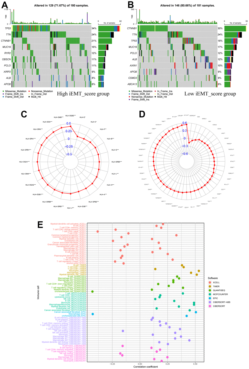 First, we analyzed somatic mutation and identified the 10 genes with the most common somatic mutation in different iEMT_score subgroups. The mutation rates of TP53, TTN, CTNNB1 and MUC16 were higher than 15% in both groups. TP53 mutation was more common in the high iEMT_score group, where CTNNB1 mutation was more common in the low iEMT_score group (Figure 5A, 5B). Next, we also explored the correlation between iEMT_score and gene expression of 48 immune checkpoints and 24 HLA families. According to Spearson analysis, the expression of 42 immune checkpoint genes and 24 HLA family genes was positively correlated with iEMT_score, and 1 immune checkpoint gene expression (ADORA2A) was negatively correlated with iEMT_score (Figure 5C, 5D). Overall, iEMT_score was positively correlated with gene expression at most immune checkpoints and gene expression in all HLA families. In addition, we investigated the correlation between immune cell infiltration levels and iEMT_score as estimated by XCELL, TIMER, QUANTISEQ, MCPCOUNTER, EPIC, CIBERSORT−ABS and CIBERSORT. After integrating the results, the iEMT_score was positively correlated with immune infiltration of B cells, neutrophils, dendritic cells, cancer-associated fibroblasts, and M2 macrophages (Figure 5E).
