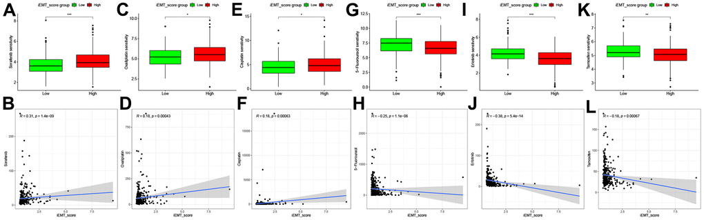 Postoperative targeted therapy and chemotherapy are critical for HCC patients, and Sorafenib remains the first-line therapy for targeted therapy in patients with advanced HCC [21]. Therefore, we explored the correlation between Sorafenib IC50 value and iEMT_score, and the results showed that patients in low iEMT_score group were more sensitive to Sorafenib (Figure 6A, 6B). In addition, we also analyzed the sensitivity of other common targeted drugs and chemotherapy drugs to different iEMT_score subgroups. Patients in the low iEMT_score group were more sensitive to Oxaliplatin and Cisplatin, while patients with high iEMT_score were more sensitive to 5-Fluorouracil, Erlotinib and Tamoxifen (Figure 6C–6L).