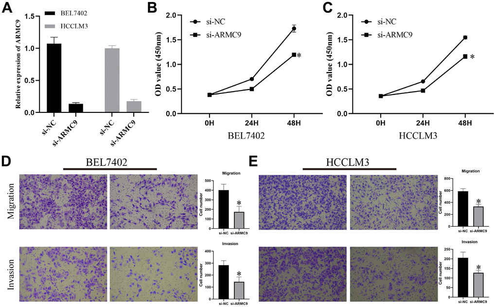 Knockdown of ARMC9 significantly inhibited the proliferation, migration and invasion of the HCC cell line HCC-LM3