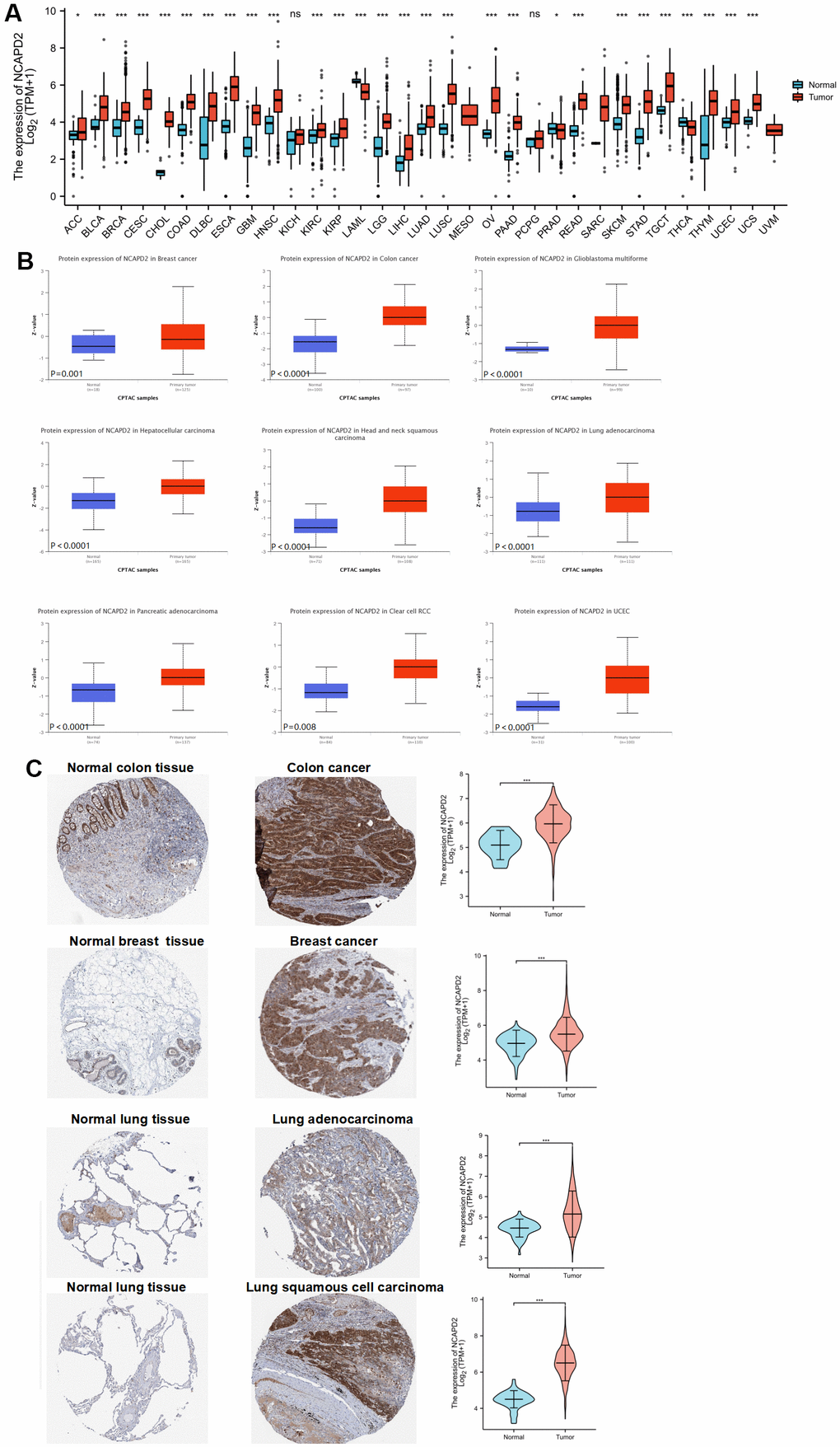 The differential expression of NCAPD2 in tumors and normal tissues were studied using the expression profile data of 33 tumors obtained from the Cancer Genome Atlas (TCGA) and the Genotype-Tissue Expression (GTEx) database. Clinical information was acquired from TCGA. The abbreviations of 33 tumors are shown in Supplementary Table 1. Subsequently, the Clinical Proteomics Tumor Analysis Consortium (CPTAC) dataset from the UALCAN database was applied to analyze NCAPD2 protein expression in breast cancer, colon cancer, uterine body endometrial cancer, lung adenocarcinoma, and ovarian cancer. The Human Protein Atlas (HPA) is an online database that provides tissue and cell distribution information for all 24,000 human proteins. Immunohistochemical images of the NCAPD2 protein in four types of tumors and corresponding normal tissues were acquired from the HPA database. Moreover, we applied the ROC curve to evaluate the diagnostic value of NCAPD2 in cancers and normal tissues using the pROC package in R. Wilcoxon test was used to study the correlation between NCAPD2 and clinical characteristics, including race, T stage, N stage, and pathological stage. Race was divided into Asian and non-Asian groups. Non-Asian people included black or African American, and White. The T stage was separated into the T1 + T2 and T3 + T4 groups, and the N stage was divided into N0, and N1&N2&N3 groups. The pathological stage was classified into stage I+II and stage III+IV stage groups.