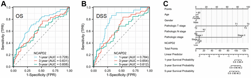 We selected liver cancer for the IHC study and we found that NCAPD2 was up-regulated in LIHC and NCAPD2 expression was related to T stage, pathologic stage, and histologic grade. NCAPD2 was an independent marker in the prognosis of OS and DSS by univariate and multivariate analysis. In addition, the time ROC curve showed that 1-, 3-, and 5-year OS and DSS were above 0.6, which was a good predictive marker.