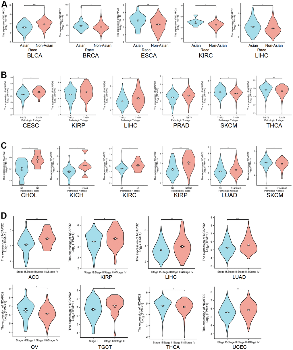 In our study, the overexpression of NCAPD2 in the vast majority of cancers was confirmed by TCGA and GTEx databases. NCAPD2 protein overexpression in BRCA, COAD, GBM, LIHC, HNSC, LUAD, PAAD, KIRC, and UCEC was confirmed in the CPTAC database. Moreover, using the HPA database, it was found that NCAPD2 expression was higher in colon, breast, and lung cancers than in normal tissues. We analyzed the correlation between NCAPD2 levels and clinical features. Interestingly, NCAPD2 expression was higher in the non-Asian group than in the Asian group for BLCA. Conversely, NCAPD2 expression was lower in the non-Asian group for BRCA, ESCA, KIRC, and LIHC. The expression of NCAPD2 was correlated with T, N, and pathological stages in some tumors. These findings illustrated the importance of NCAPD2 in tumor progression. Furthermore, we evaluated the effect of NCAPD2 expression on the prognosis of cancer patients. NCAPD2 overexpression was associated with poor prognosis with OS, and DSS in ACC, KIRP, LGG, LIHC, LUAD, MESO, PAAD, SARC, SKCM, and UCEC. The ROC of NCAPD2 was above 0.8 in 20 types of cancer, indicating a better diagnostic ability to distinguish between tumor tissue and normal tissue.