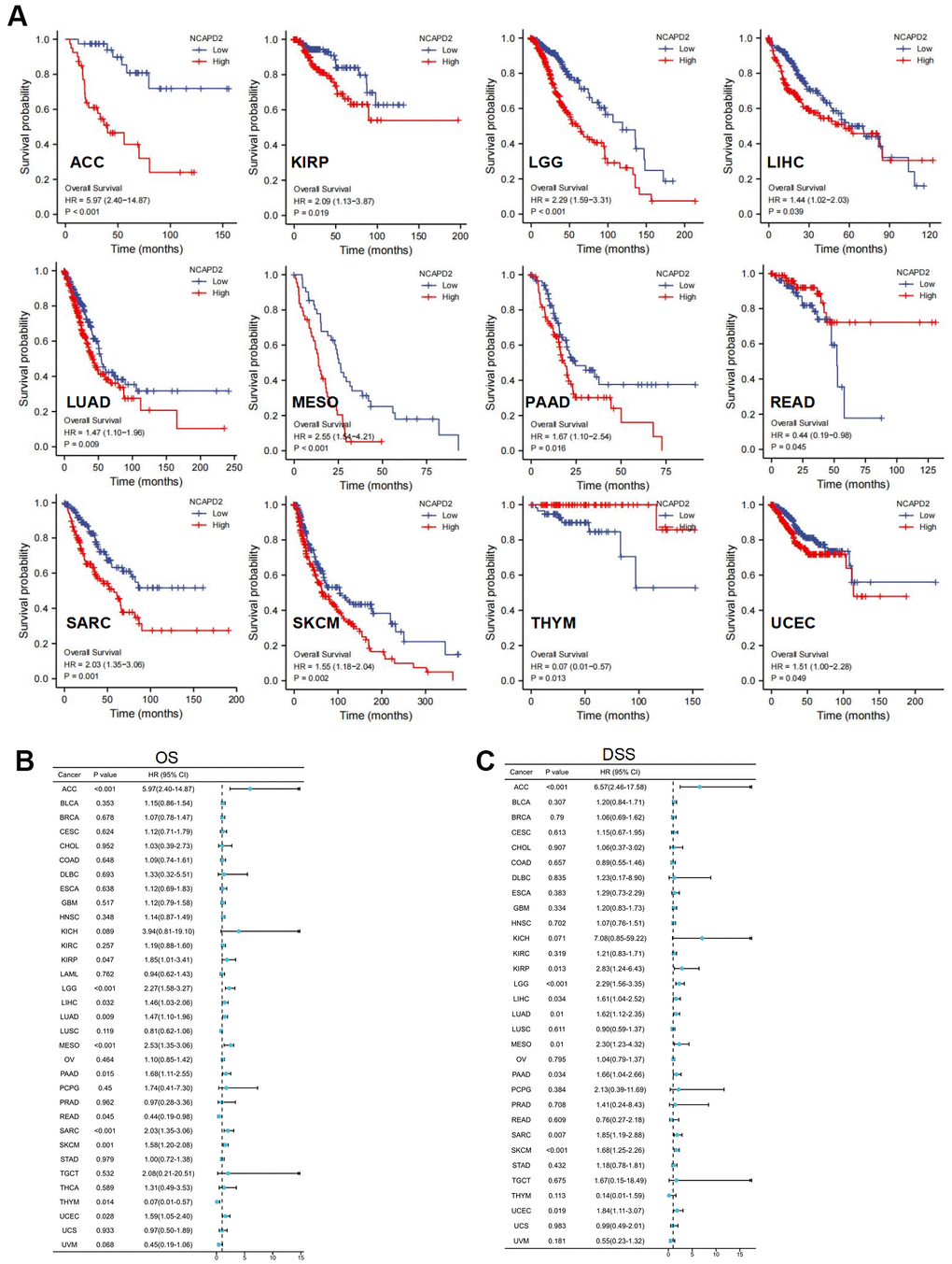 Kaplan-Meier survival curves revealed that NCAPD2 in the high-expression group had worse OS for ACC, KIRP, LGG, LIHC, LUAD, MESO, PAAD, SARC, SKCM, and UCEC but better OS for READ, and THYM (Figure 3A). We selected OS, and DSS to investigate the prognostic value of NCAPD2 in different cancers. OS analysis showed that NCAPD2 was significantly associated with ACC, KIRP, LGG, LIHC, LUAD, MESO, PAAD, READ, SARC, SKCM, THYM, and UCEC. Overexpression of NCAPD2 was a hazard factor for ACC, KIRP, LGG, LIHC, LUAD, MESO, PAAD, SARC, SKCM, and UCEC and a protective factor for READ and THYM (Figure 3B). DSS results showed that NCAPD2 was a risk factor for ACC, KIRP, LGG, LIHC, LUAD, MESO, PAAD, SARC, SKCM, and UCEC (Figure 3C). Therefore, OS and DSS results showed that NCAPD2 in ACC, KIRP, LGG, LIHC, LUAD, MESO, PAAD, SARC, SKCM, and UCEC had poor outcomes.