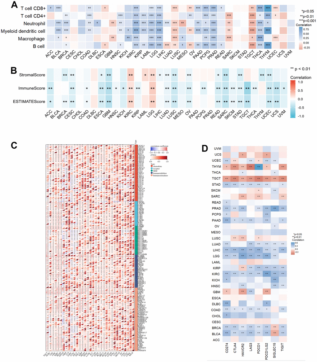 Correlation analysis of NCAPD2 expression with tumor microenvironment (TME) and immune checkpoints in pan-cancer