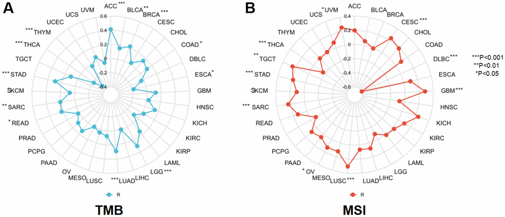 TMB and MSI are two highly effective biomarkers for tumor immunotherapy that have attracted clinical attention. TMB is defined as the incidence of somatic mutations per million bases. Previous studies have confirmed that patients with high TMB are responsive to immunotherapy and are emerging biomarkers that are sensitive to immune checkpoint inhibitors [9–15]. MSI refers to the emergence of new microsatellite alleles due to the insertion or deletion of repetitive units at microsatellite loci in tumors. MSI results from functional defects in DNA mismatch repair of tumors. Similar to TMB, it has been demonstrated to be an important biomarker for the clinical potency of anti-PD-1/PD-L1 immune checkpoint inhibitors [16]. Therefore, correlation analysis with TMB and MSI is beneficial for the evaluation of immunotherapy response.