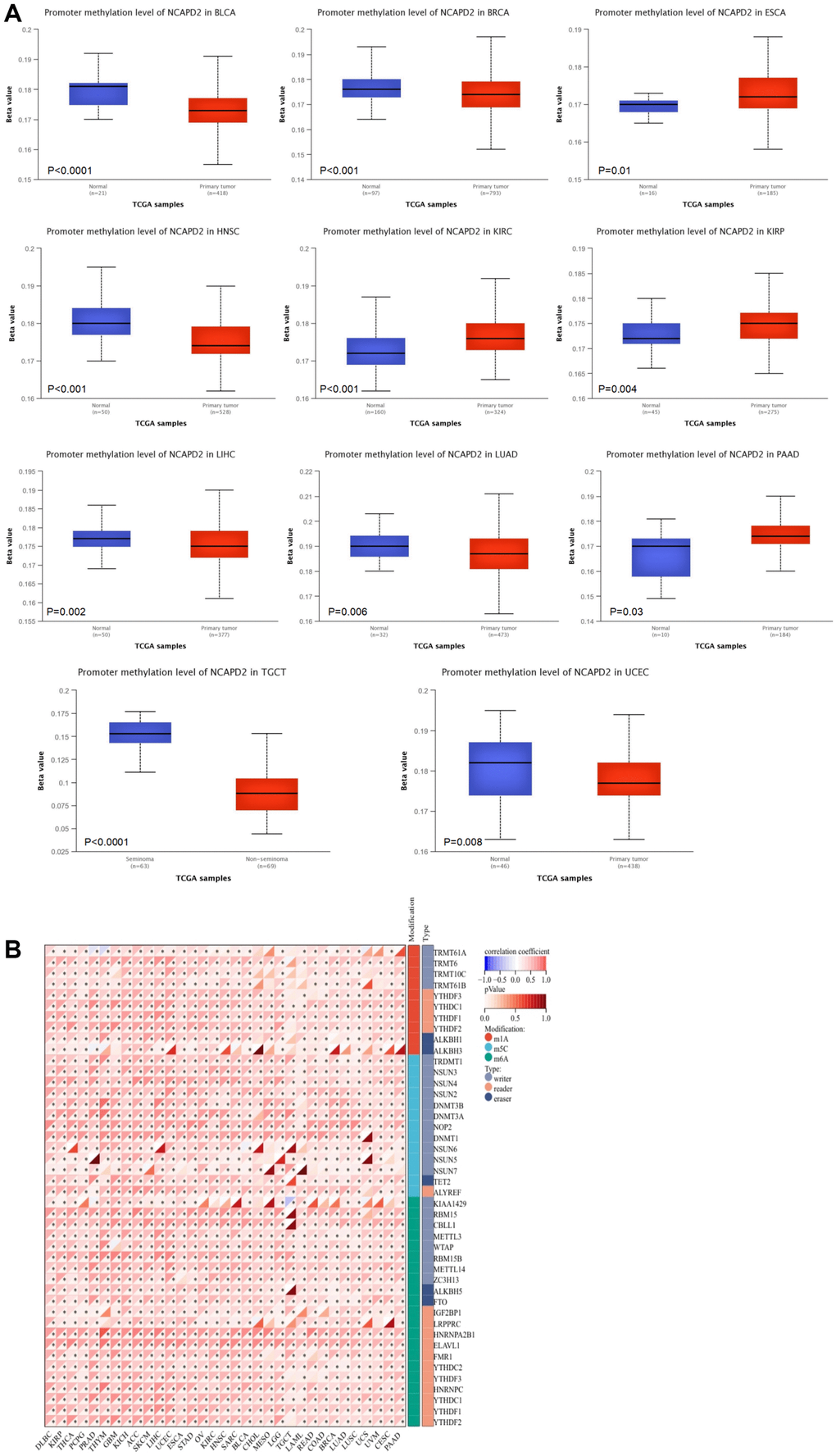 DNA methylation and RNA methylation are two types of epigenetic modifications that play a major role in the progression of malignant tumors and may be significant markers for tumor diagnosis, treatment, and prognosis [17–19]. We analyzed promoter methylation levels in cancer and normal tissues using the UALCAN database [20]. RNA methylation mainly involves m6A, m5C, and m1A, which are composed of writers, readers, and erasers. Spearman’s correlation was used to investigate the relationship between NCAPD2 expression and m6A, m5C, and m1A regulatory genes.