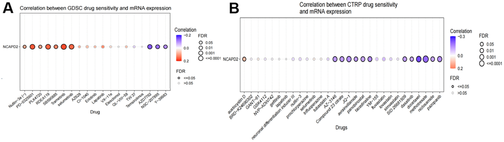 Multiple drugs that were sensitive to NCAPD2 were predicted using the GDSC and CTRP datasets from the GSCA database. In the GDSC dataset, there was a negative correlation between NCAPD2 and 50% inhibitory concentration (IC50) values of AZD7762, NSC-207895, and Y-39983. In the CTRP dataset, there was a negative correlation between NCAPD2 and the IC50 values of 12 types of drugs: methotrexate, docetaxel, pazopanib, SID26681509, dasatinib, niclosamide, JQ-1, compound 23 citrate, AZ-3146, avrainvillamide, panobinostat, and tacedinaline. These results indicate that NCAPD2 is significantly related to different drug sensitivities in different tumor cell lines and may be a promising cancer treatment target (Figure 8).