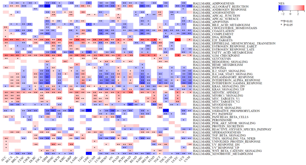 To study the biological function and oncogenic pathways involved in NCAPD2, we downloaded the “gmt” file of the hallmark gene sets (h.all.v7.4. symbols. gmt) from MSigDB (https://www.gsea-msigdb.org/gsea/msigdb/index.jsp), which contains 50 marker gene sets. We then divided NCAPD2 into low- and high-expression groups, and performed gene set enrichment analysis (GSEA) in 33 tumors by the R package “cluster Profiler” [21]. The results were visualized using heat maps. Statistical significance was set at P < 0.05 and FDR < 0.25.