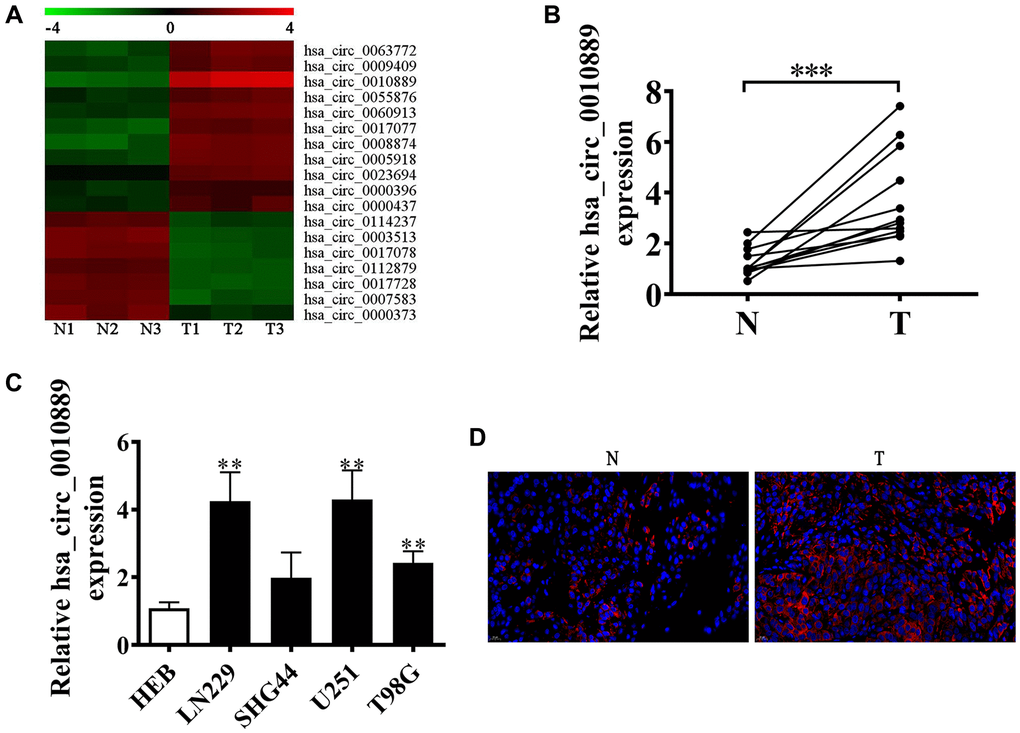 Accumulating evidence suggests that circRNA has an important function in glioma progression [8, 9]. However, its regulatory mechanism is unknown. In our current investigation, we employed next-generation sequencing (NGS) and found that circRNA displayed abnormal expression in glioma tissues when compared to adjacent normal tissues (Figure 1A). Furthermore, RT-qPCR showed high levels of circRNA hsa_circ_0010889 expressions as detected by NGS. Our data show that hsa_circ_0010889 expression was significantly upregulated in glioma tissues (Figure 1B) and RT-qPCR showed that circ-PITHD1 expression increased in several glioma cell lines (SHG44, U251, T98G and LN229) when compared to normal glial HEB cell lines. U251 and LN229 cells have higher hsa_circ_0010889 expression (Figure 1C). FISH data showed that hsa_circ_0010889 expression increased in glioma tumor tissues when compared to adjacent normal tissues (Figure 1D).
