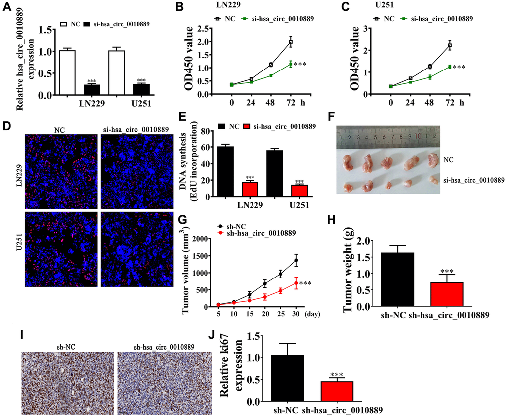 To determine a role for hsa_circ_0010889 in glioma progression, we constructed an siRNA against hsa_circ_0010889 (si-hsa_circ_0010889), and transfected this into both LN229 and U251 cells. Results showed that hsa_circ_0010889 significantly decreased post hsa_circ_0010889 silencing in U251 and LN229 cells (Figure 2A). Our CCK8 (Figure 2B, 2C) and EdU (Figure 2D, 2E) assays showed that downregulation of hsa_circ_0010889 significantly decreased the proliferation ability of both LN229 and U251 cells. The tumor progression in xenografted nude mice using LN229 cells showed that silencing hsa_circ_0010889 significantly decreased tumor growth in both weight and volume (Figure 2F–2H). Immunohistochemical staining for Ki67 confirmed that hsa_circ_0010889 silencing inhibited Ki67 expression in tumor tissues (Figure 2I, 2J) implying that hsa_circ_0010889 downregulation inhibited glioma proliferation and tumor growth in vitro and in vivo experiments.