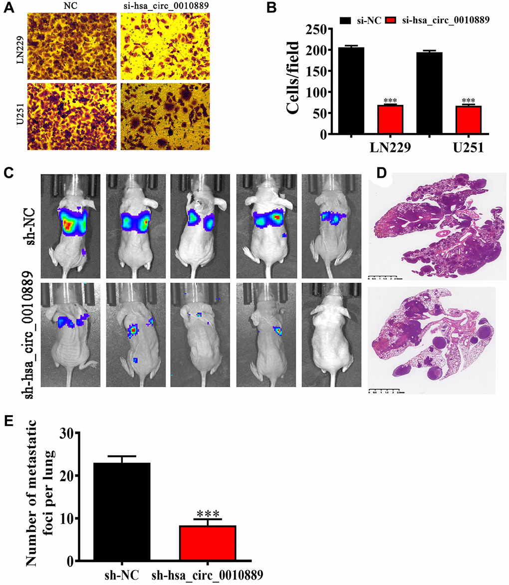 Transwell assays looking at migration showed that hsa_circ_0010889 silencing inhibited migration in both LN229 and U251 cells (Figure 3A, 3B) and live imaging data revealed that LN229 cells metastasized to the pulmonary system and that hsa_circ_0010889 silencing decreases this pulmonary metastatic capability. H&E staining also confirmed that hsa_circ_0010889 silencing reduced metastatic foci count in lung tissues (Figure 3C–3E) suggesting that hsa_circ_0010889 downregulation inhibited glioma cells invasion.