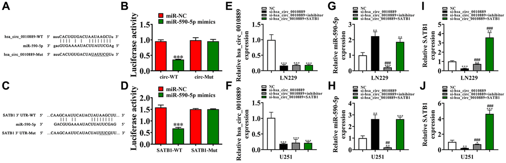 Furthermore, RT-qPCR results showed that hsa_circ_0010889 expression decreased post transfected with hsa_circ_0010889 silencing vector. But a miR-590-5p inhibitor or overexpression of SATB1 had no effect on hsa_circ_0010889 expression in U251 and LN229 cells (Figure 4E, 4F), suggesting that SATB1 and miR-590-5p were downstream targets of hsa_circ_0010889. RT-qPCR data also found that hsa_circ_0010889 silencing increased miR-590-5p expression and that SATB1 overexpression had no effect on si-hsa_circ_0010889-induced miR-590-5p expression inhibition (Figure 4G, 4H), suggesting that miR-590-5p was downstream of hsa_circ_0010889. Results also showed that hsa_circ_0010889 silencing decreased SATB1 expression. However, miR-590-5p downregulation reversed the inhibitory effects of si-hsa_circ_0010889 to SATB1 expression. When using the post SATB1 overexpression vector, we found that SATB1 expression increased significantly (Figure 4I, 4J) implying that hsa_circ_0010889 promoted SATB1 expression via sponging of miR-590-5p.