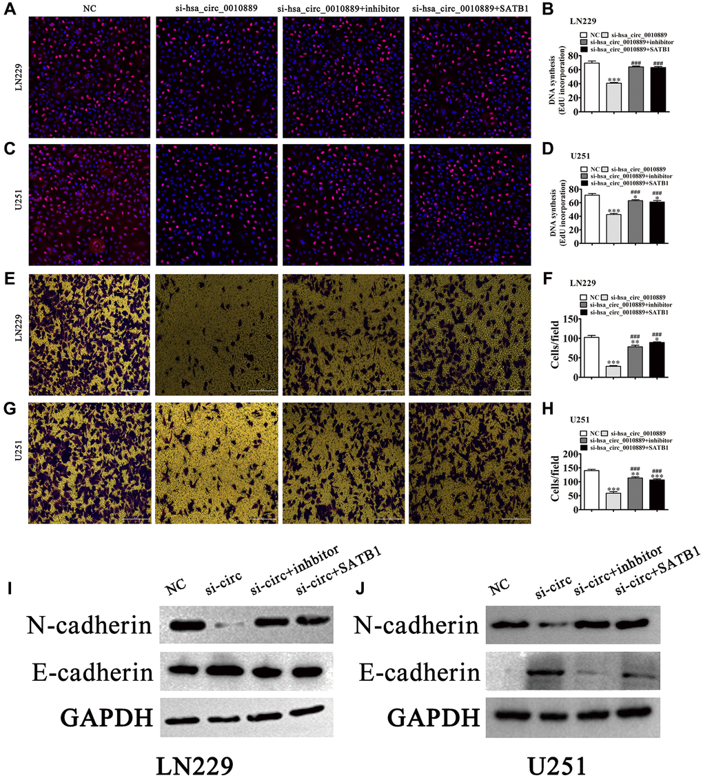 Using EdU (Figure 5A–5D) we found that SATB1 overexpression or miR-590-5p inhibition restored glioma cell proliferation ability in both LN229 and U251 cells post hsa_circ_0010889 silencing (Figure 5C–5E). Transwell assays for the detection of migration showed that SATB1 overexpression or miR-590-5p suppression restored glioma cell migration ability in LN229 and U251 cells post silencing of hsa_circ_0010889 (Figure 5E–5H). Western blot detection show that SATB1 overexpression or miR-590-5p inhibition restored glioma cell EMT-related protein expression post silencing of hsa_circ_0010889 (Figure 5I and 5J).