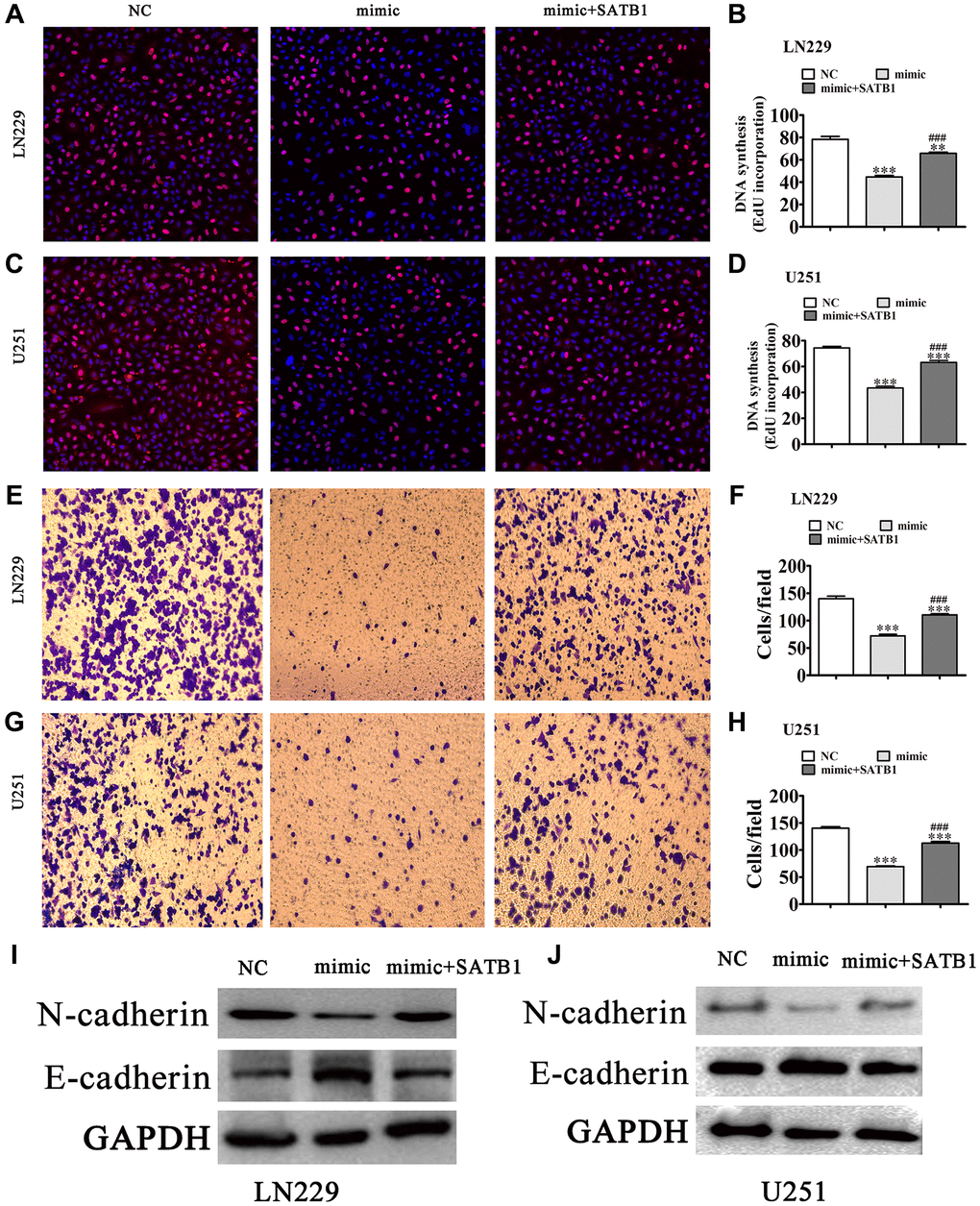 Again, using EdU (Figure 6A–6D) detection we found that overexpression of SATB1 restored glioma cell proliferation in both LN229 and U251 cells post miR-590-5p overexpression (Figure 5C–5E). Transwell assays also showed that overexpression of SATB1 restored glioma cell migration ability in both U251 and LN229 cells after overexpression of miR-590-5p (Figure 6E–6H). Western blot results showed that SATB1 overexpression restored EMT-related protein expression after miR-590-5p overexpression (Figure 6I and 6J).
