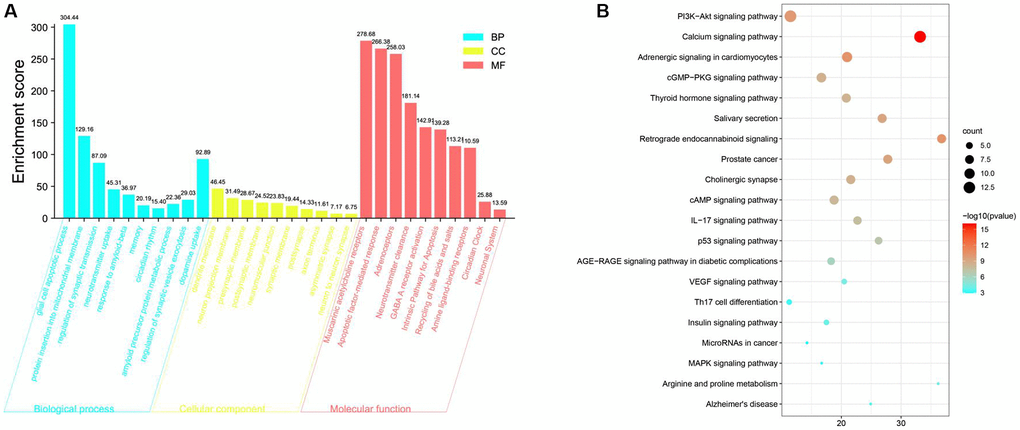 The underlying biological processes (BPs), cellular components (CCs) and molecular functions (MFs) of the 376 target genes were identified by performing Gene Ontology (GO) enrichment analysis. By setting the filter to an adjusted p value < 0.05 and q-value < 0.05, 1711 significantly enriched GO terms were identified. The first 30 terms are shown in Figure 1A. GO terminology suggests that these target genes play essential roles in mitochondrial regulation of intersynaptic neurotransmitter transport and intracellular metabolic waste removal, affecting cognitive function (Figure 1A).