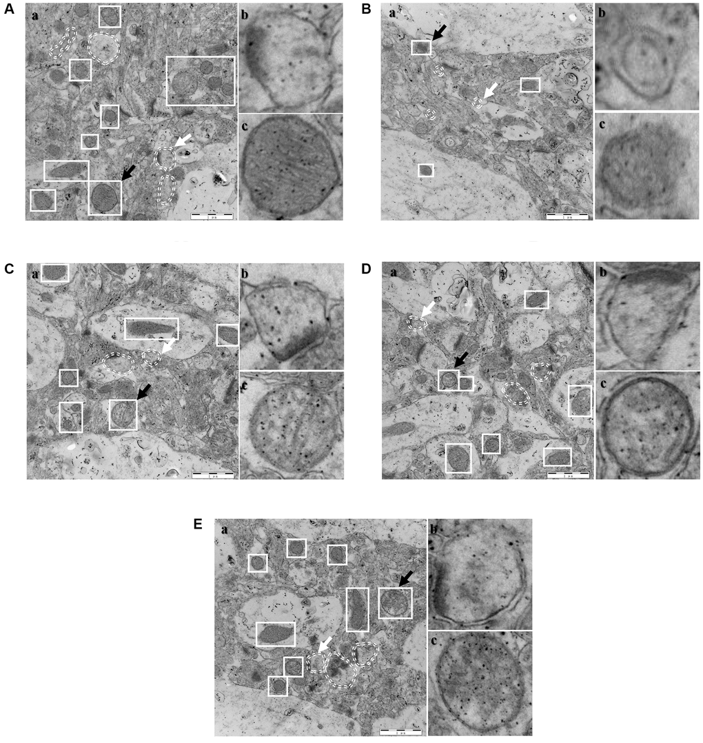 Mitochondria and autophagosomes in the hippocampus were the focus of TEM detection. Typical autophagosomes in each group were represented by white elliptical dotted lines, and mitochondria were enclosed by white solid square lines (Figure 10A; the results from each group are shown). The lysosomes (white arrow) and mitochondria (black arrow) in each group were magnified (Figure 10B and 10C) and indicated on the right side for each group. A specific number of autophagosomes was observed in the control group and presented a typical structure of the bilayer membrane and contents and no obvious outflow of contents. The mitochondrial membrane structure was intact, and the cristae were intact. In the model group, the number of autophagosomes was reduced, and the volume of autophagosomes with a bilayer membrane structure was smaller. The mitochondrial membrane structure was incomplete, the cristae were disrupted, and the volume was substantially reduced. The SCPE-treated groups showed a significant reversal of the changes in autophagosomes and mitochondria in the CI model, primarily manifested as increases in the number and volume of lysosomes; the structure and contents of bilayer membranes were also markedly changed, and some of the pathological changes in the contents were mitigated (Figure 10D, 10E). The number of mitochondria was significantly increased, the membrane structure was intact, and the cristae were intact, suggesting that SCPE promoted mitochondrial metabolism in CI mice and hippocampal autophagy.