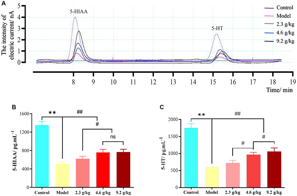 Compared with the control group, the concentrations of the two neurotransmitters in the dialysate of the model group were significantly decreased (P < 0.01). Compared with the model group, the levels of 5-HT and 5-HIAA in the dialysate of mice in the 4.6 g/kg and 9.2 g/kg groups were significantly increased (P < 0.01). Compared with the 2.3 g/kg group, the levels of 5-HT and 5-HIAA in the dialysate of both the 4.6 g/kg and 9.2 g/kg groups were significantly increased (P < 0.01). Compared with the 4.6 g/kg group, the level of 5-HT in the dialysate of the 9.2 g/kg group was significantly increased (P < 0.01).