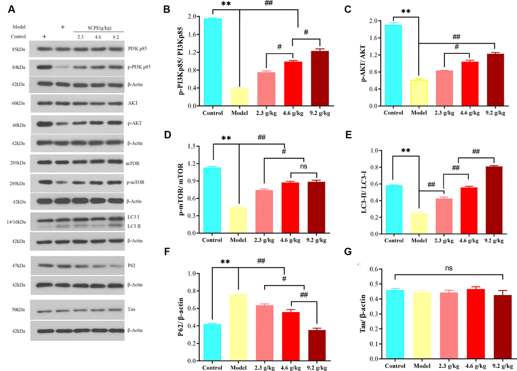 Compared with the control group, the ratios of p-PI3Kp85/PI3Kp85, p-AKT/AKT, p-mTOR/mTOR, and LC3-II/LC3-I in the hippocampus of the model group were significantly decreased (P < 0.01), and the expression level of the P62 protein was significantly increased (P < 0.01). Compared with the model group, the ratios of p-PI3Kp85/PI3Kp85, p-AKT/AKT, p-mTOR/mTOR, and LC3-II/LC3-I in the hippocampus of mice in the SCPE-treated groups were significantly increased (P < 0.01), but the expression level of the P62 protein was significantly decreased (P < 0.01). Compared with the 2.3 g/kg SCPE-treated group, the ratios of p-PI3Kp85/PI3Kp85, p-AKT/AKT, p-mTOR/mTOR, and LC3-II/LC3-I in the hippocampus of the 4.6 g/kg and 9.2 g/kg SCPE-treated groups were significantly increased (P < 0.01), and the expression level of the P62 protein was significantly decreased (P < 0.01). Compared with the 4.6 g/kg SCPE-treated group, the p-PI3KP85/PI3Kp85 and LC3-II/LC3-I ratios in the hippocampus of mice in the 9.2 g/kg SCPE-treated group were significantly increased (P < 0.01), and the expression level of the P62 protein was significantly decreased (P < 0.01). A significant change in the expression level of the Tau protein was not observed in the hippocampus of all the groups (P > 0.05).