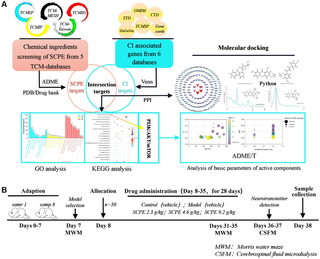 Kaixin San (KXS), SCPE and other Chinese herbal medicines [35] have been proven to improve hippocampal neurodegenerative changes and cognitive functions in patients with CI. SCPE contains various active components that directly target brain tissue to play a role in the treatment of CI, suggesting that it exerts a therapeutic effect that other drugs cannot. This effect has been confirmed in the systems pharmacology prediction part of this study. Our research team has long been committed to bioinformatics, basic mechanistic studies and evaluations of the clinical efficacy of TCM in preventing and treating CI. The mechanism of the treatment of CI by SCPE has been extensively discussed in previous studies, but TCM compounds often have multiple components and multiple targets, and certain limitations exist in the study of the effective components and basic properties of the mechanism of SCPE therapy for CI.