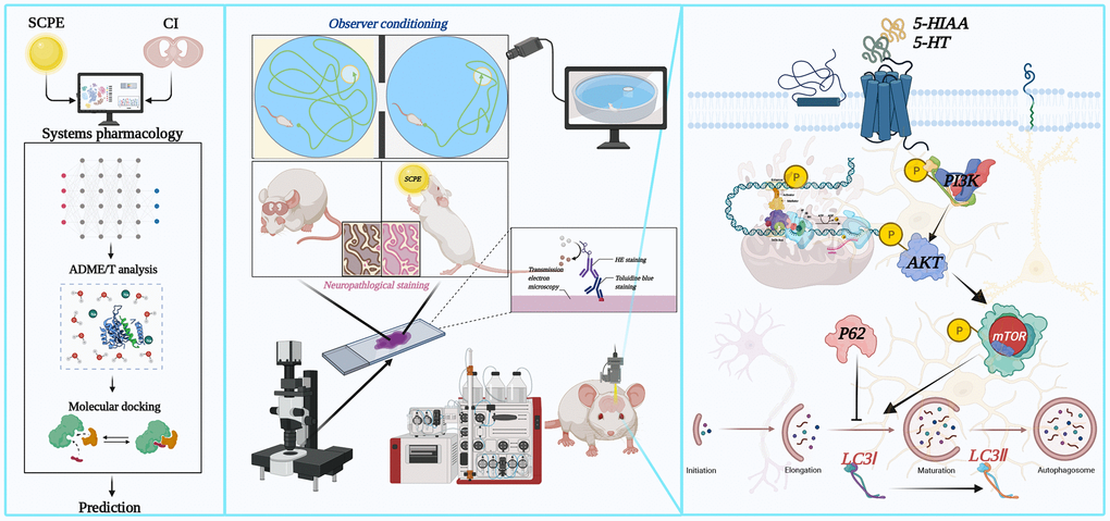 In recent years, systems pharmacology in the treatment of diseases has attracted extensive attention worldwide. Systems pharmacology and artificial intelligence technology represent effective methods to screen and predict drug targets. Based on these research methods, this study revealed the active components of SCPE involved in the treatment of CI and further revealed their potential mechanism of action. According to the GO analysis and most relevant signaling pathways identified by KEGG enrichment analysis, the PI3K/AKT/mTOR signaling pathway and pharmacodynamic Chinese medicine monomers in SCPE were selected to construct a PPI network and perform molecular docking verification.