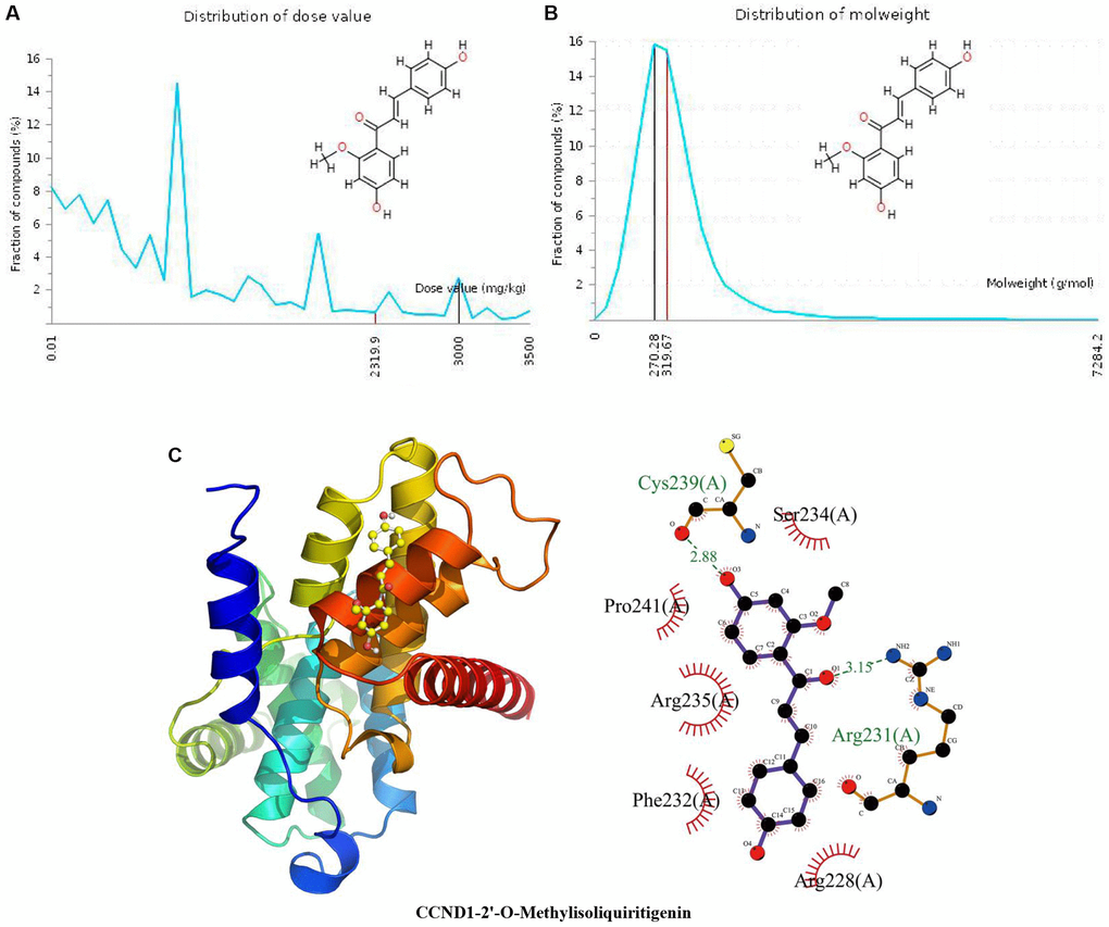The distribution of the calculated LD50 values is shown in Figure 2A. The mean of the dataset is shown in red (2319.9 mg/kg), and the predicted median lethal dose of the input 2’-O-methylisoliquiritigenin is shown in black (3000 mg/kg). Figure 2B indicates the MW distribution of 2’-O-methylisoliquiritigenin in our dataset. The mean MW is indicated as a red line (319.67 g/mol), whereas the MW of the input compound is indicated as a black line (270.28 g/mol). These results indicate that 2’-O-methylisoliquiritigenin is a candidate compound with good properties. In Figure 2C, the calculated binding pose of ligands of 2’-O-methylisoliquiritigenin to the CCND1 protein was −6.0 kcal/mol, demonstrating a good binding effect. 2’-O-Methylisoliquiritigenin interacts with the CCND1 protein primarily by forming hydrogen bonds with Arg231 (A) and Cys2239 (A) with lengths of 3.15 Å and 2.88 Å, respectively, through hydrophobic interactions. Hydrophobic bonds often play a key role in the formation of space-folded biofilms of protein polypeptide chains, the interaction between macromolecules, and the catalysis of enzymes on substrate molecules. It is hydrophobic with Arg228 (A), Phe232 (A), Arg235 (A), Pro241 (A), and Ser234 (A).