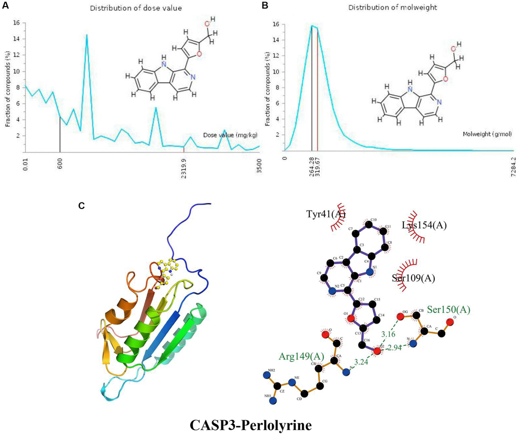 The distribution of the calculated LD50 values is shown in Figure 4A. The mean of the dataset is shown in red (2319.9 mg/kg), and the predicted median lethal dose of the input perlolyrine is shown in black (600 mg/kg). Figure 4B indicates the MW distribution of perlolyrine in our dataset. The mean MW is indicated as a red line (319.67 g/mol), whereas the MW of the input compound is indicated as a black line (264.28 g/mol). These results indicate that perlolyrine is a toxic candidate compound to a certain extent. In Figure 4C, the calculated binding pose of the ligands of perlolyrine to the CASP3 protein was −6.4 kcal/mol, demonstrating a good binding effect. Perlolyrine interacts with CASP3 mainly through hydrogen bonds with Arg149 (A) and Ser150 (A) with lengths of 3.24 Å, 3.16 Å and 2.94 Å, respectively, and hydrophobic interactions. Perlolyrine is hydrophobic with Ser109 (A), Lys154 (A), and Tyr41 (A).