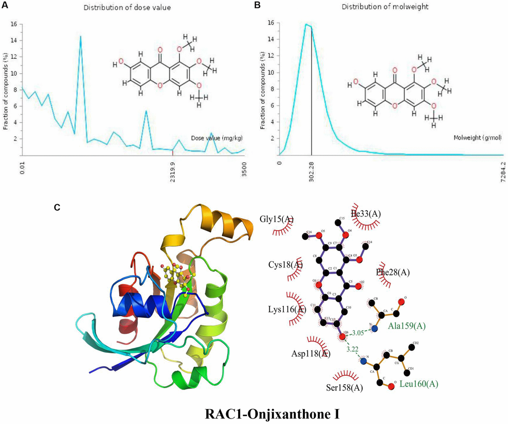 The distribution of the calculated LD50 values is shown in Figure 5A. The mean of the dataset is shown in red (2319.9 mg/kg). Figure 5B indicates that the MW of the input Onjixanthone I is indicated as a black line (302.28 g/mol). These results indicate that Onjixanthone I is a candidate toxic compound to a certain extent. The calculated binding pose of the ligands of Onjixanthone I to RAC1 protein was −7.0 kcal/mol, indicating that Onjixanthone I had a good binding effect (Figure 5C). Onjixanthone I interacts with the RAC1 protein mainly through the formation of hydrogen bonds and hydrophobic interactions and forms hydrogen bonds with Ala159 (A) and Leu160 (A) with lengths of 3.05 Å and 3.22 Å, respectively, Ser158 (A), Asp118 (A), Lys116 (A), Cys18 (A), Gly15 (A), Ile33 (A), and Phe28 (A).