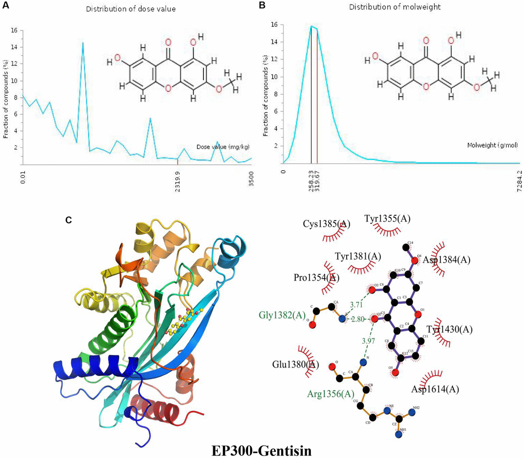 The distribution of the calculated LD50 values is shown in (Figure 6A). The mean of the dataset is shown in red (2319.9 mg/kg). Figure 6B indicates the MW distribution of gentisin in our dataset. The mean MW is indicated as a red line (319.67 g/mol), whereas the MW of the input gentisin is indicated as a black line (258.23 g/mol). These results indicate that gentisin is a candidate compound with good properties. The calculated binding pose of ligands of gentisin to the EP300 protein was −7.0 kcal/mol, demonstrating a good binding effect (Figure 6C). Gentisin interacts with the EP300 protein primarily by forming hydrogen bonds with Arg1356 (A) and Gly1382 (A) with lengths of 3.97 Å, 2.80 Å and 3.71 Å, respectively, and hydrophobic interactions. Gentisin is also hydrophobic with Glu1380 (A), Pro1354 (A), Tyr1381 (A), Cys1385 (A), Tyr1355 (A), Asp1384 (A), Tyr1430 (A) and Asp1614 (A).